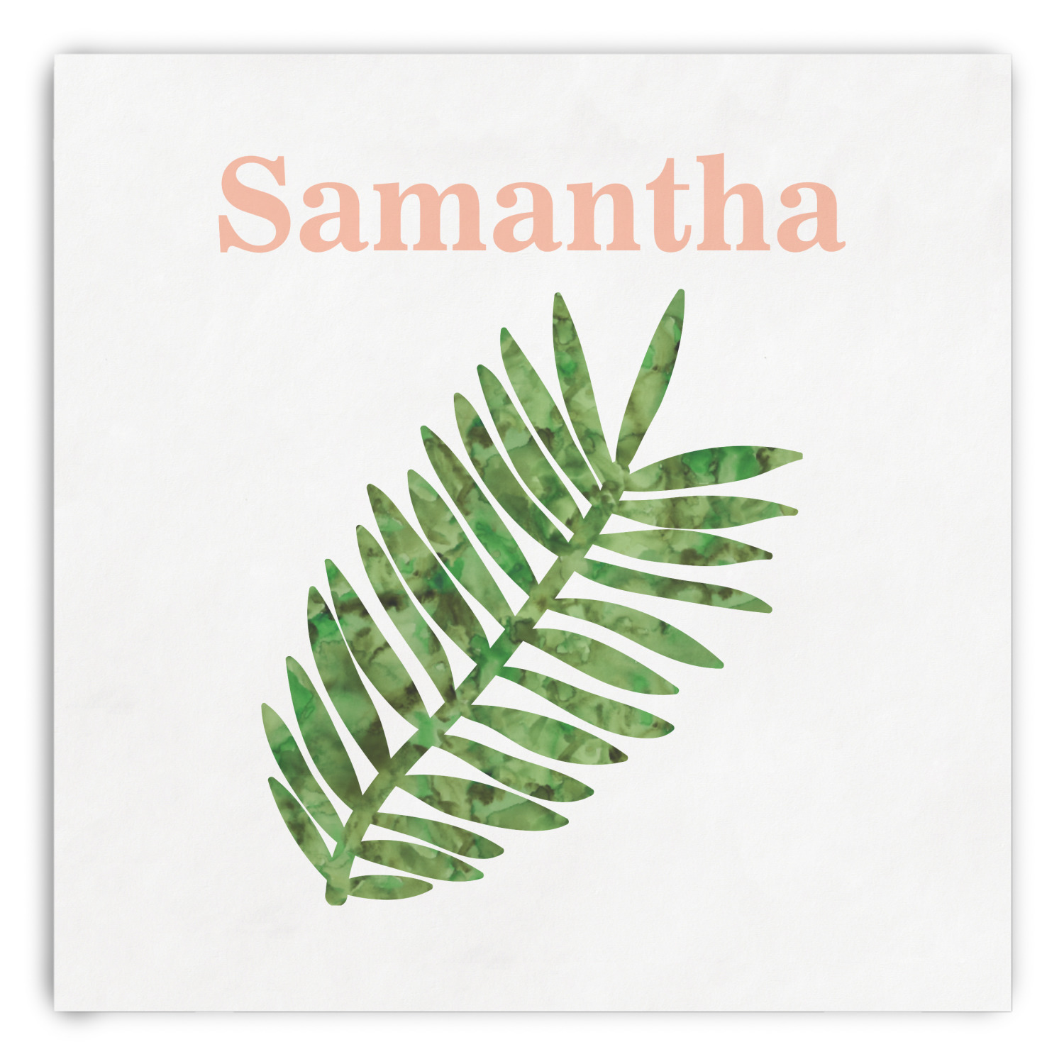 The background of the main design is filled with thin tropical leaves scattered about. The leaves are filled with a dark green watercolor texture. The ribbon and scalloped frame are filled with a light peach watercolor texture. The monogram in the middle gives an extra feminine touch to this design.