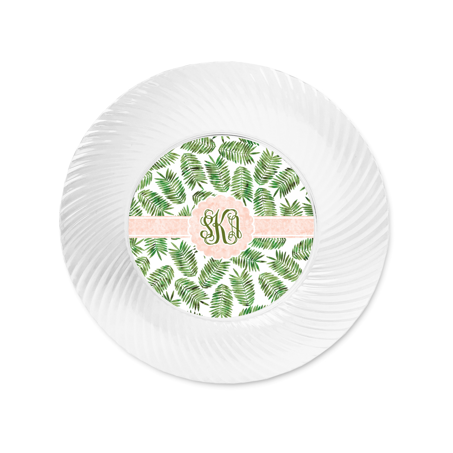 The background of the main design is filled with thin tropical leaves scattered about. The leaves are filled with a dark green watercolor texture. The ribbon and scalloped frame are filled with a light peach watercolor texture. The monogram in the middle gives an extra feminine touch to this design.