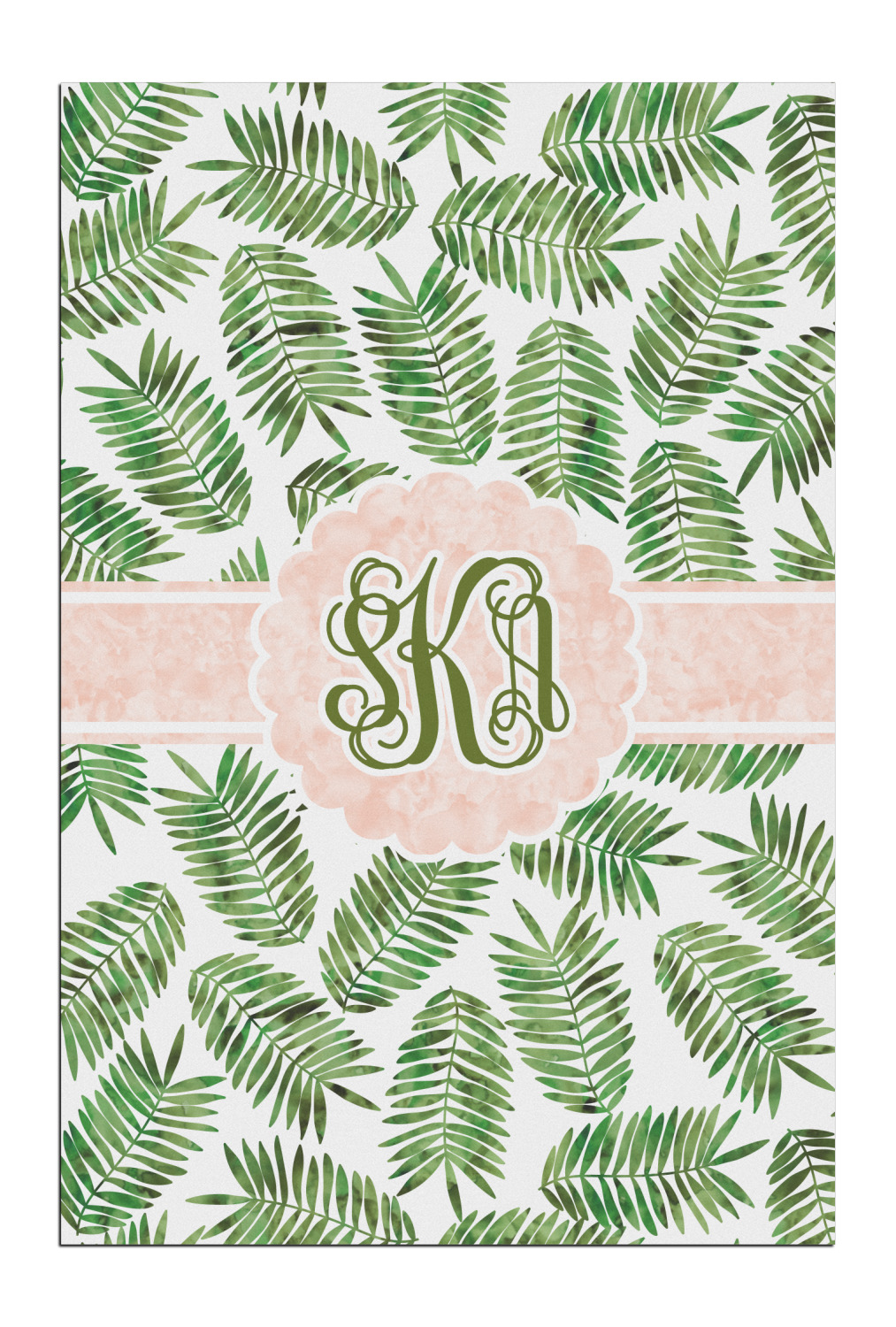 The background of the main design is filled with thin tropical leaves scattered about. The leaves are filled with a dark green watercolor texture. The ribbon and scalloped frame are filled with a light peach watercolor texture. The monogram in the middle gives an extra feminine touch to this design.