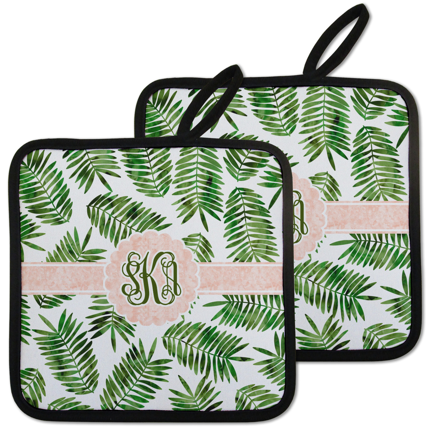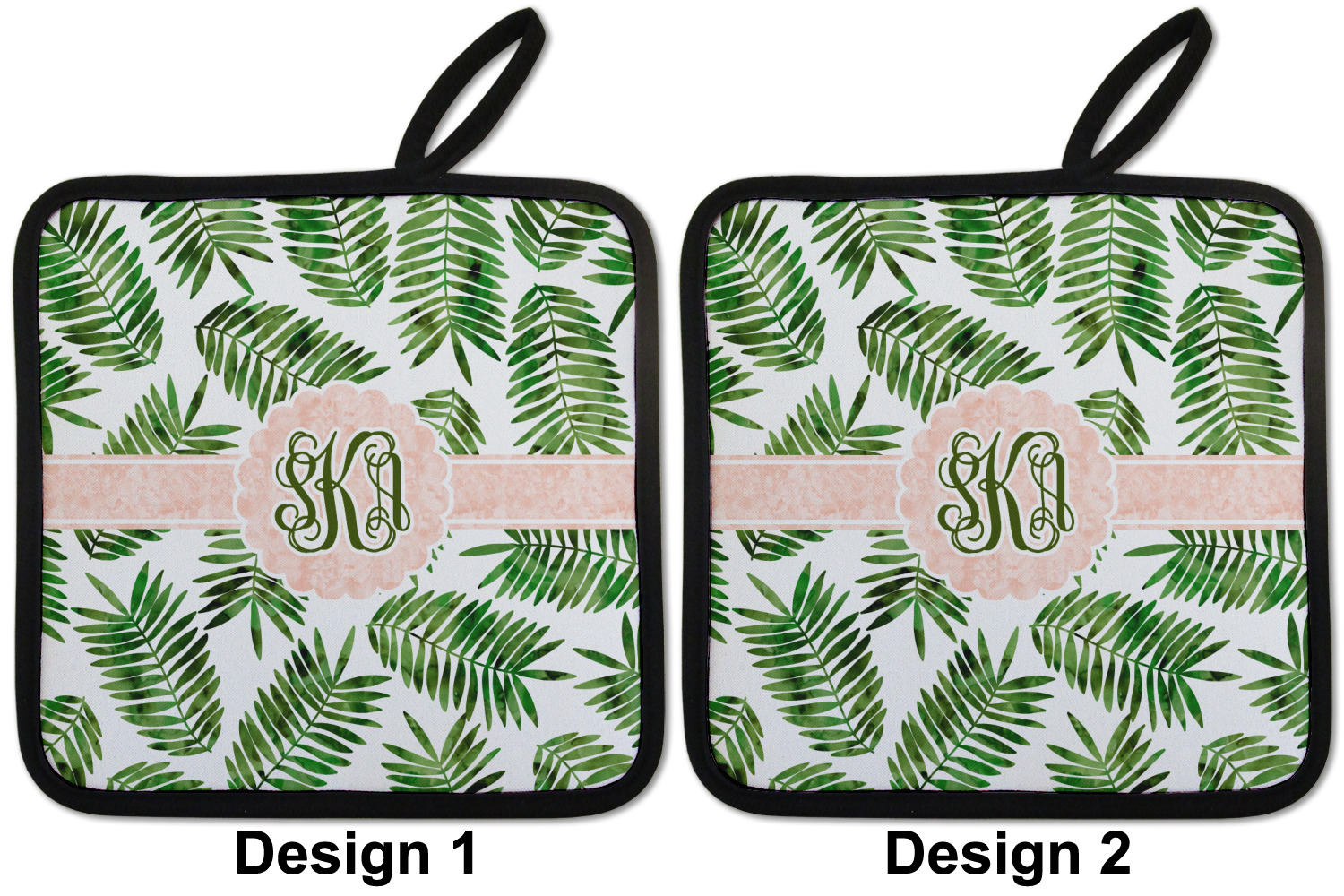 Our personalized pot holders feature a neoprene front that displays your personalization in vibrant colors. The backing of the hot pot holder is rubberized; the textured backing allows you to have a great grip when using this custom pot holder. The two materials are joined with a sleek, black trim, and the holder also includes an attached loop for hanging and storage. The pot holder is approximately 8.75 inches by 8.75 inches and 0.25 inches tall, while the fabric loop is 2.5 inches long. You can purchase a kitchen pot holder by itself or as a set of 2. We also offer a set including one pot holder and one oven mitt.