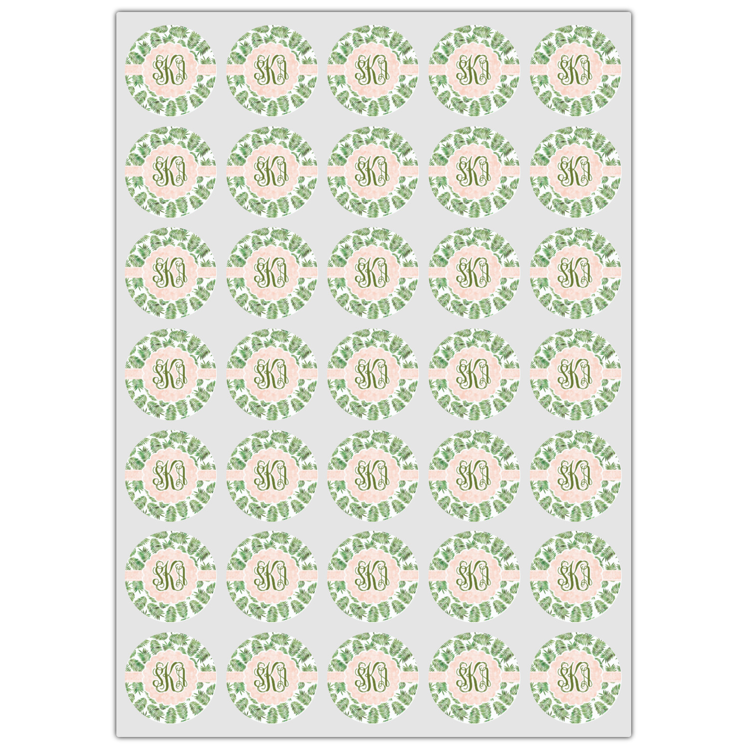 The background of the main design is filled with thin tropical leaves scattered about. The leaves are filled with a dark green watercolor texture. The ribbon and scalloped frame are filled with a light peach watercolor texture. The monogram in the middle gives an extra feminine touch to this design.