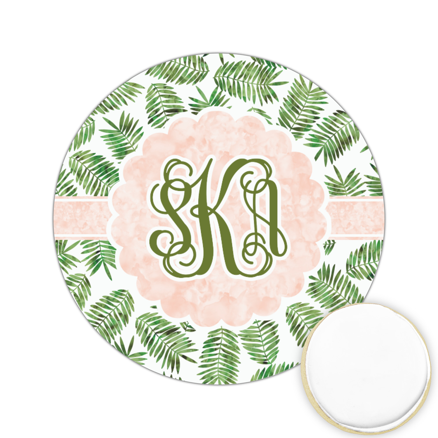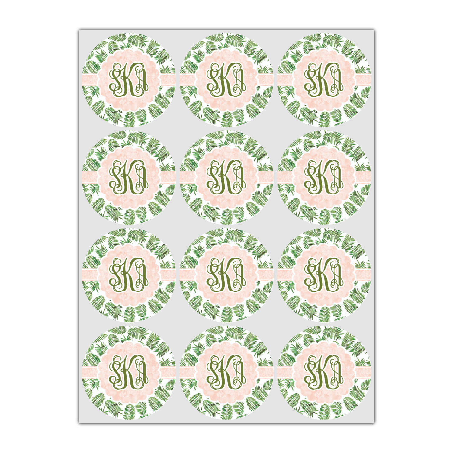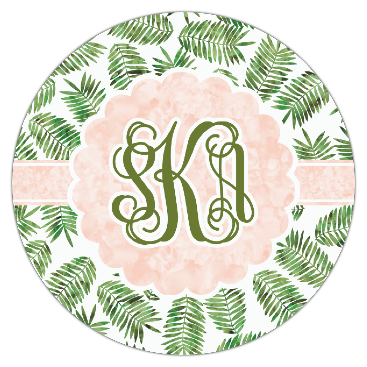 The background of the main design is filled with thin tropical leaves scattered about. The leaves are filled with a dark green watercolor texture. The ribbon and scalloped frame are filled with a light peach watercolor texture. The monogram in the middle gives an extra feminine touch to this design.
