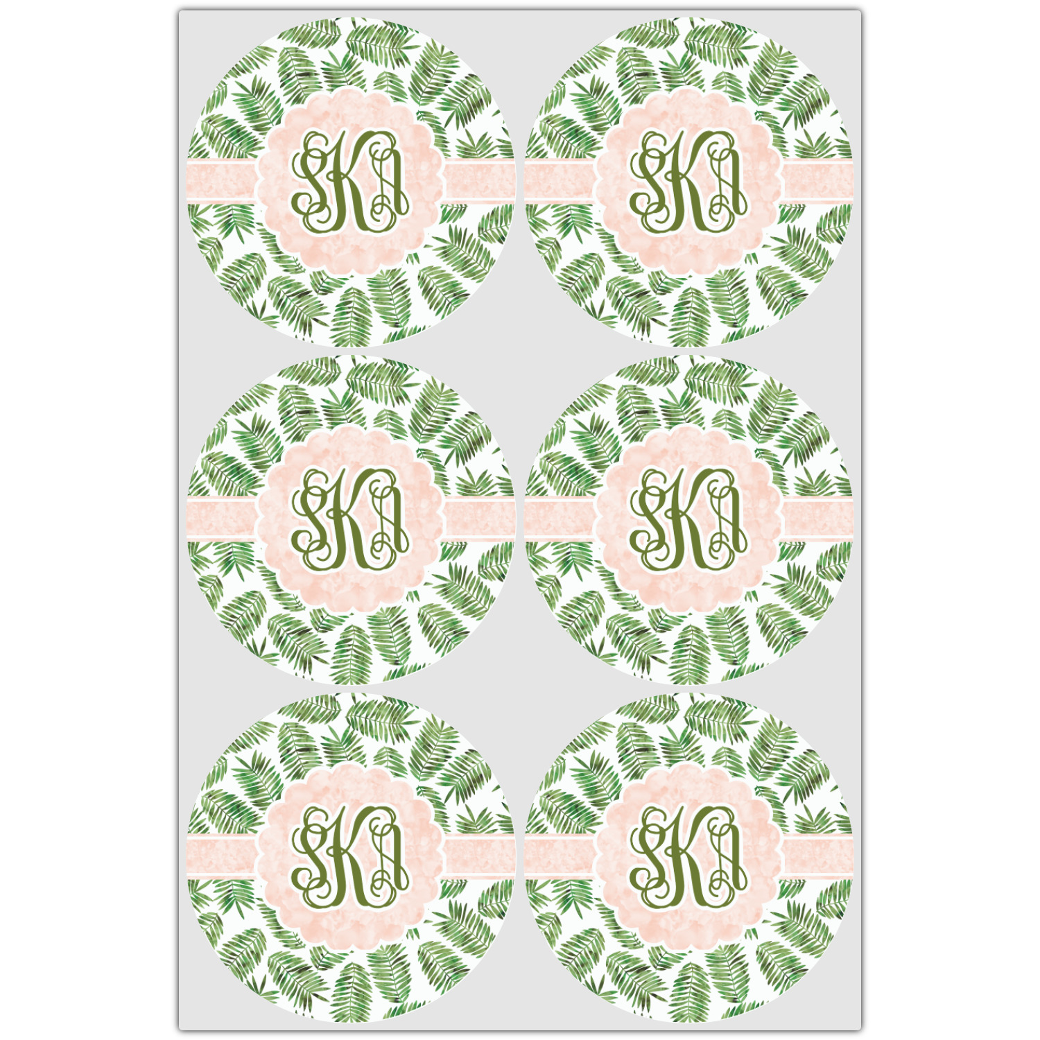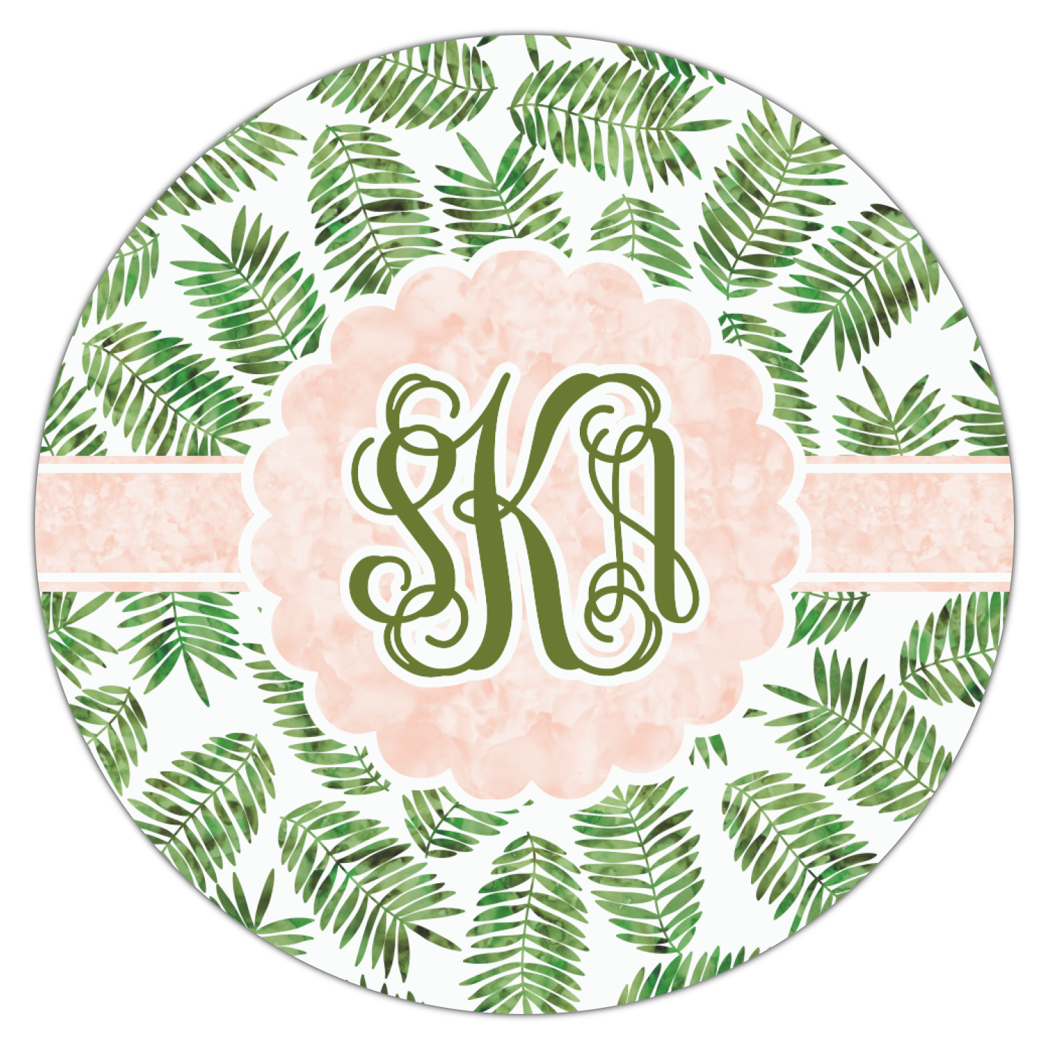 The background of the main design is filled with thin tropical leaves scattered about. The leaves are filled with a dark green watercolor texture. The ribbon and scalloped frame are filled with a light peach watercolor texture. The monogram in the middle gives an extra feminine touch to this design.