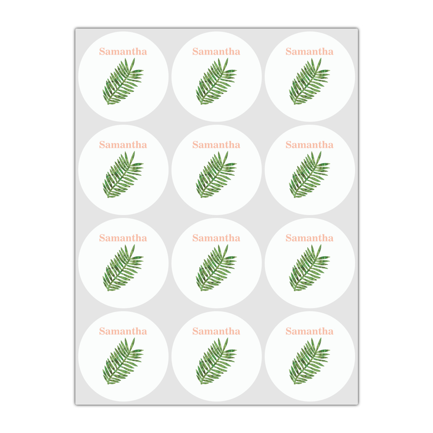 The background of the main design is filled with thin tropical leaves scattered about. The leaves are filled with a dark green watercolor texture. The ribbon and scalloped frame are filled with a light peach watercolor texture. The monogram in the middle gives an extra feminine touch to this design.