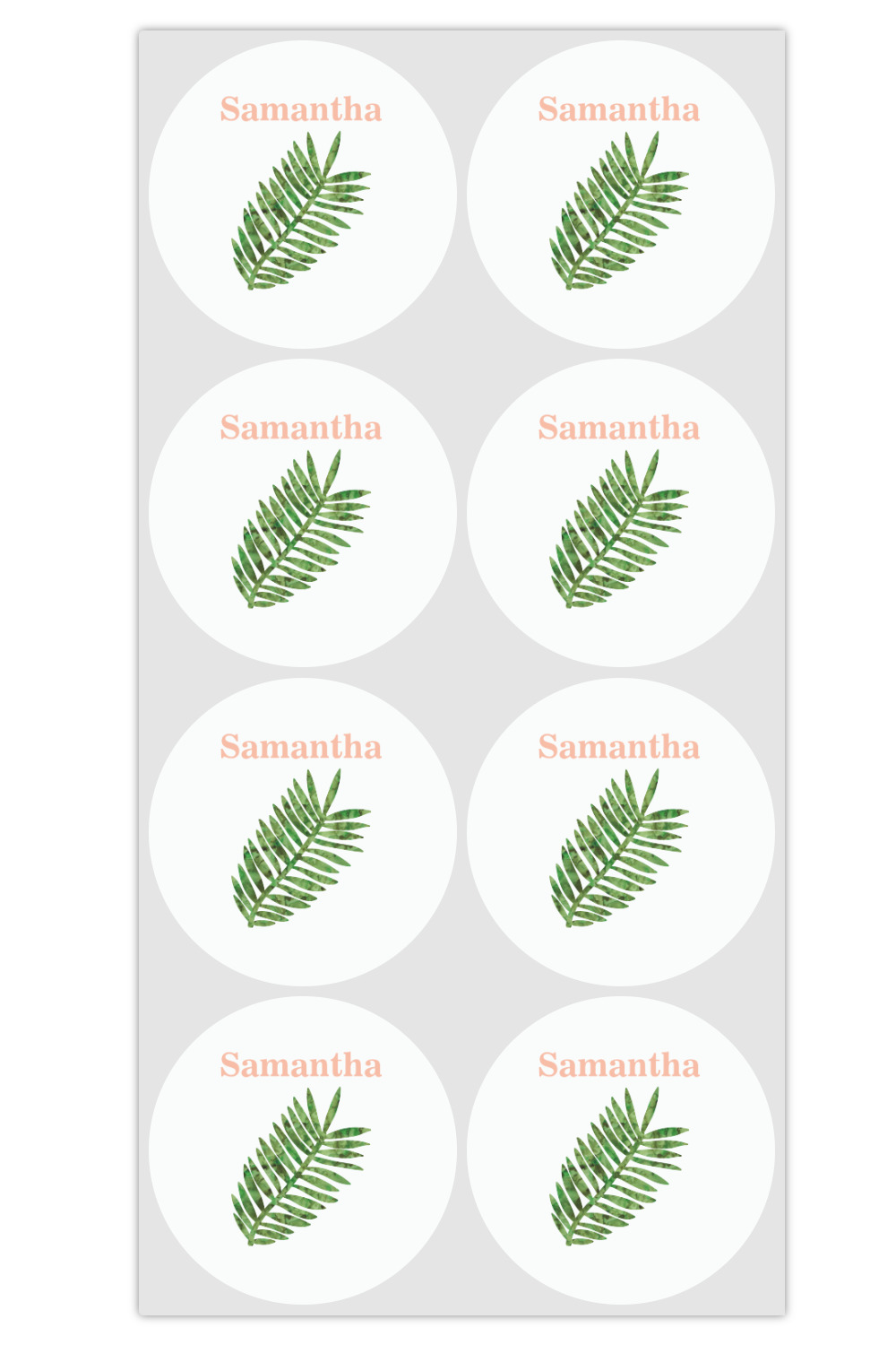 The background of the main design is filled with thin tropical leaves scattered about. The leaves are filled with a dark green watercolor texture. The ribbon and scalloped frame are filled with a light peach watercolor texture. The monogram in the middle gives an extra feminine touch to this design.