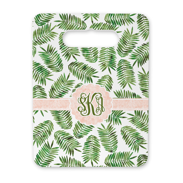 The background of the main design is filled with thin tropical leaves scattered about. The leaves are filled with a dark green watercolor texture. The ribbon and scalloped frame are filled with a light peach watercolor texture. The monogram in the middle gives an extra feminine touch to this design.