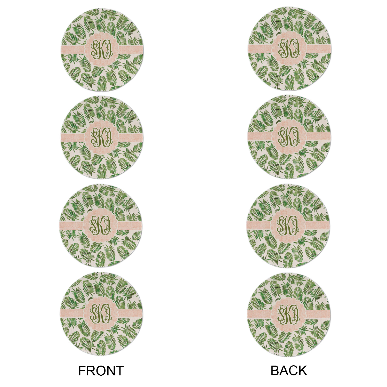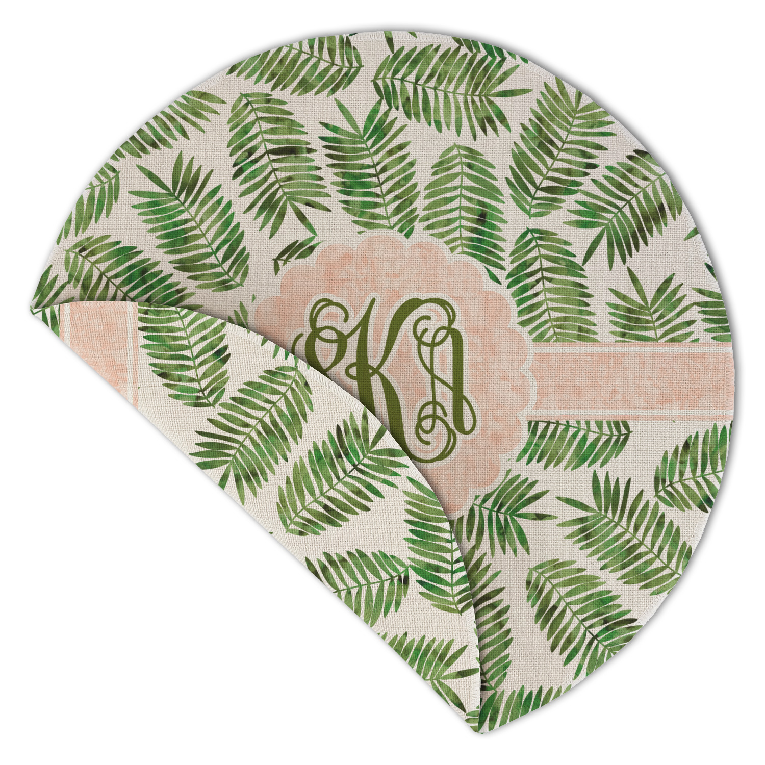 The background of the main design is filled with thin tropical leaves scattered about. The leaves are filled with a dark green watercolor texture. The ribbon and scalloped frame are filled with a light peach watercolor texture. The monogram in the middle gives an extra feminine touch to this design.