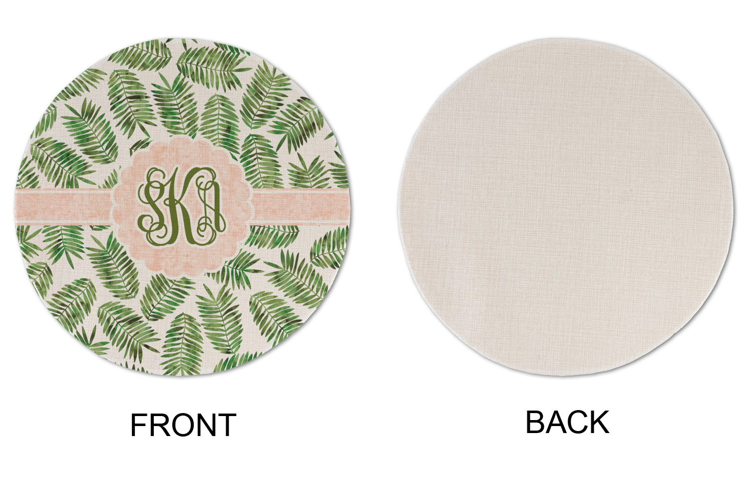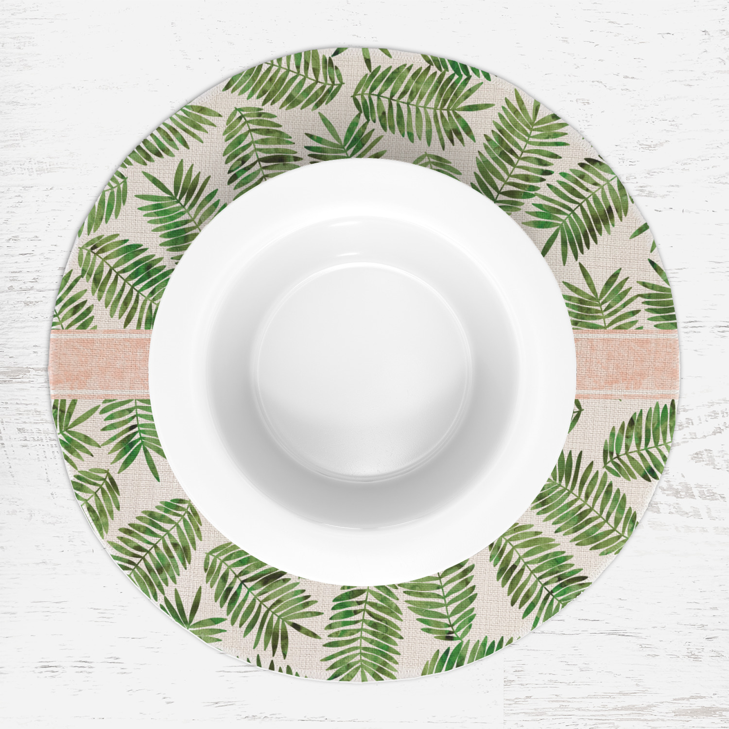 The background of the main design is filled with thin tropical leaves scattered about. The leaves are filled with a dark green watercolor texture. The ribbon and scalloped frame are filled with a light peach watercolor texture. The monogram in the middle gives an extra feminine touch to this design.