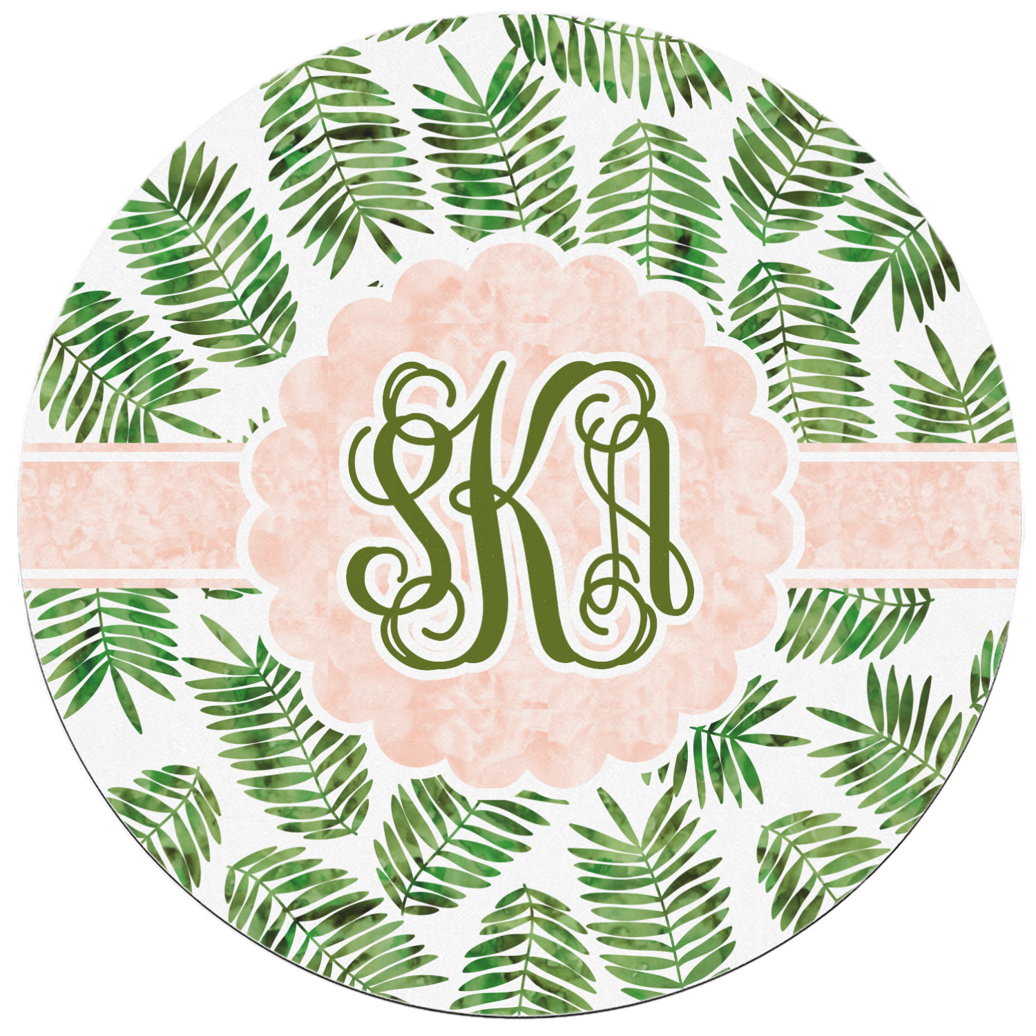 The background of the main design is filled with thin tropical leaves scattered about. The leaves are filled with a dark green watercolor texture. The ribbon and scalloped frame are filled with a light peach watercolor texture. The monogram in the middle gives an extra feminine touch to this design.
