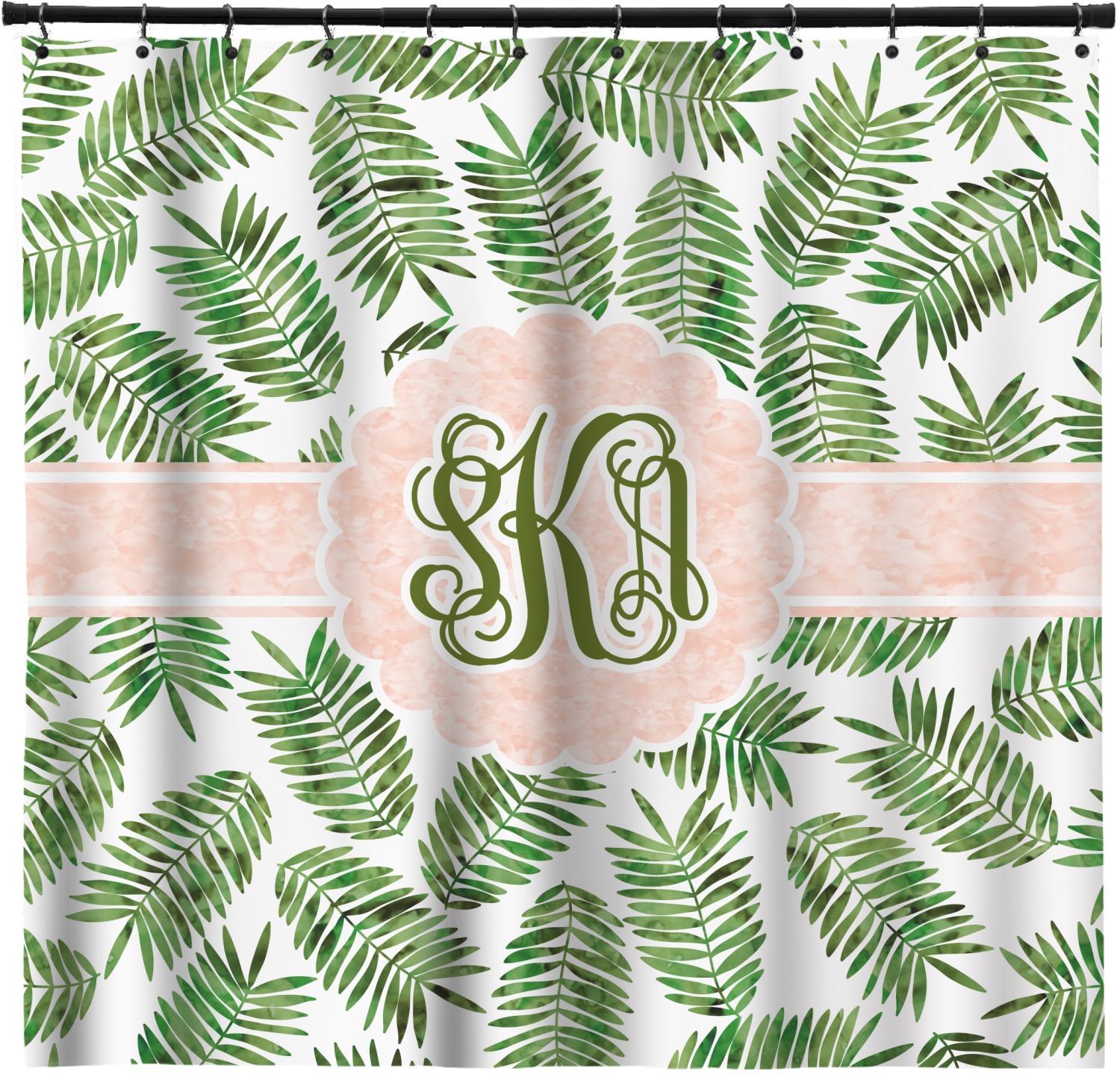 The background of the main design is filled with thin tropical leaves scattered about. The leaves are filled with a dark green watercolor texture. The ribbon and scalloped frame are filled with a light peach watercolor texture. The monogram in the middle gives an extra feminine touch to this design.