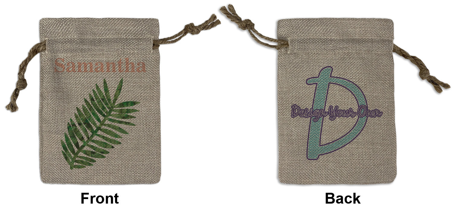 We sell our Burlap Gift Bags in 3 variant sized bags. Made with burlap polyester, each personalized bag can be secured with a twine drawstring pull. Your custom design is available to print on one side or both sides - completely up to you! The sizes of the bags measure approximately 4.5" x 6.5" for the smallest size, 6.5" x 8.0" for the medium size, and 6.5" x 13.5" for the large-sized bag.