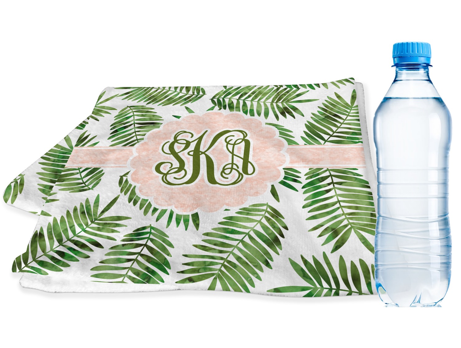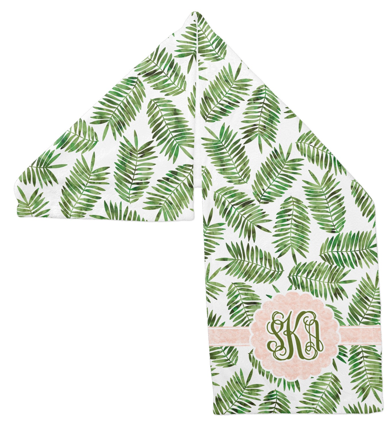 The background of the main design is filled with thin tropical leaves scattered about. The leaves are filled with a dark green watercolor texture. The ribbon and scalloped frame are filled with a light peach watercolor texture. The monogram in the middle gives an extra feminine touch to this design.