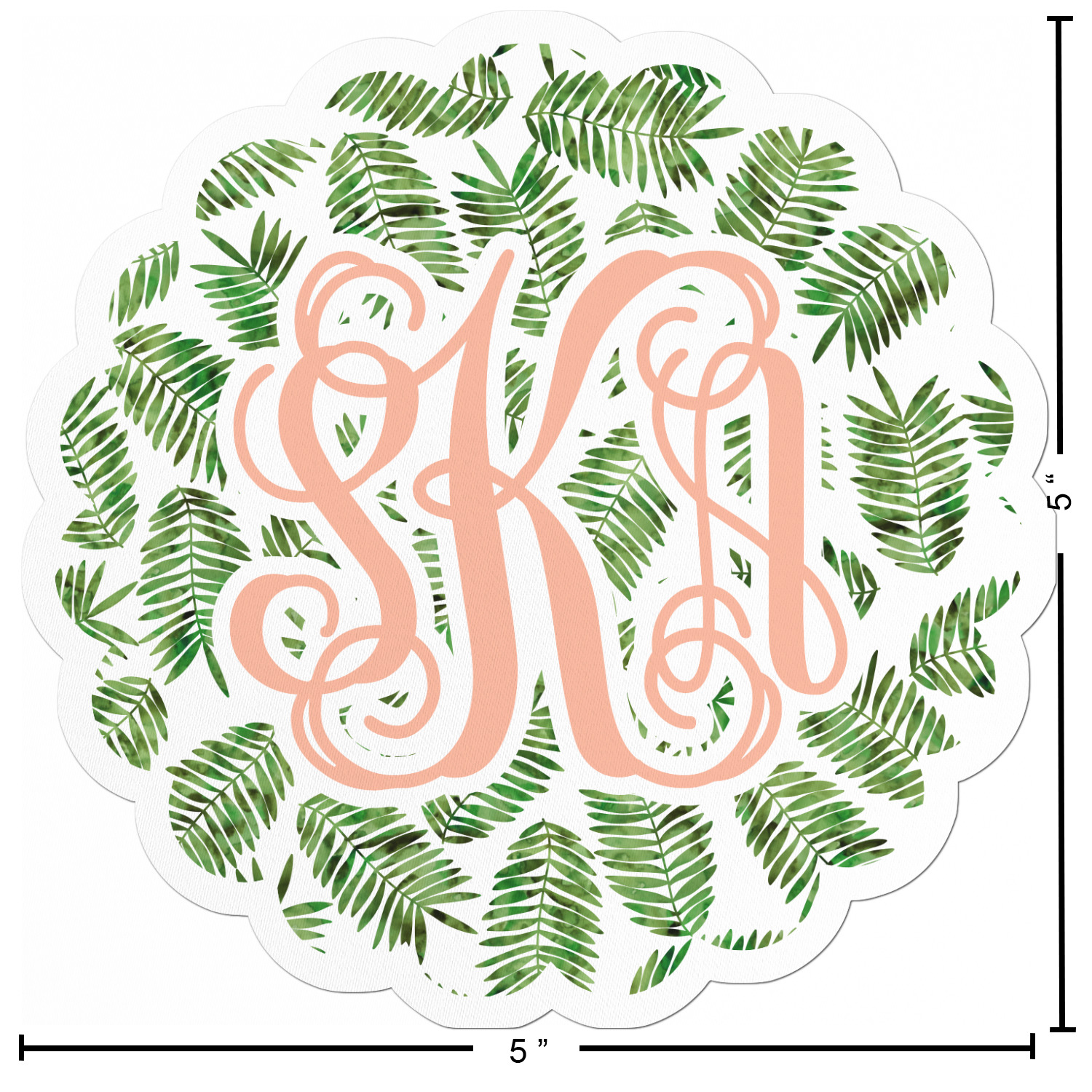 The background of the main design is filled with thin tropical leaves scattered about. The leaves are filled with a dark green watercolor texture. The ribbon and scalloped frame are filled with a light peach watercolor texture. The monogram in the middle gives an extra feminine touch to this design.