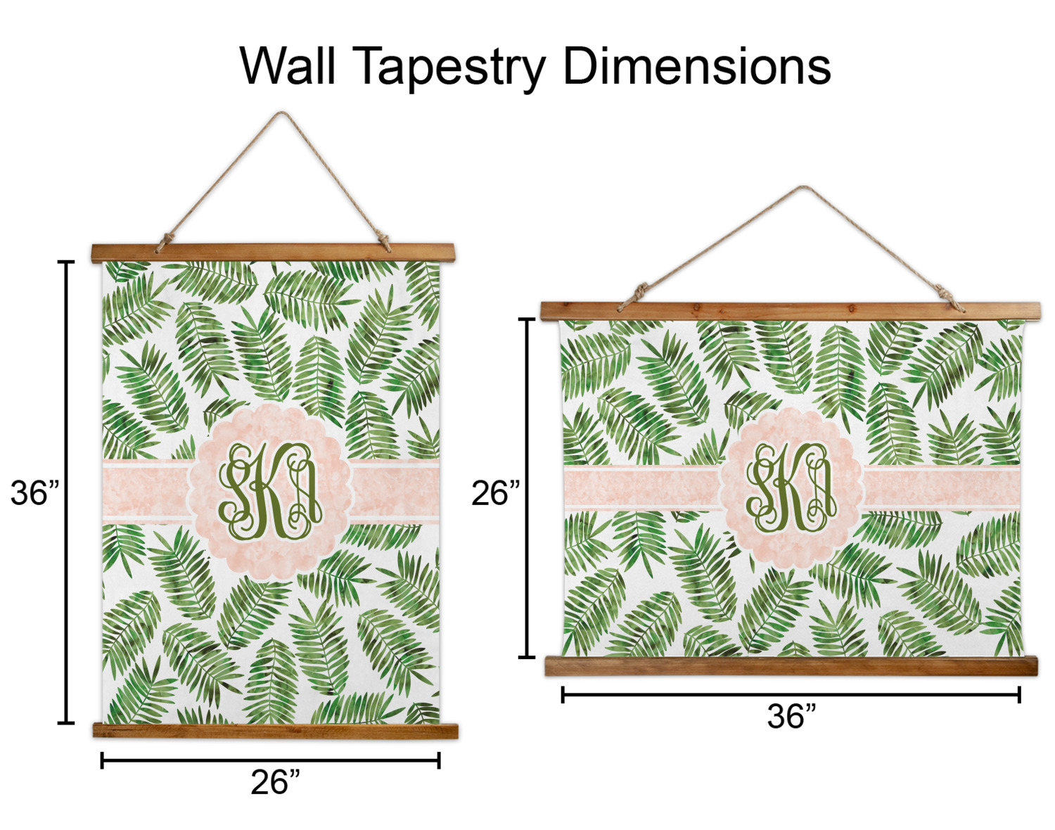 Made in two different orientations - portrait or landscape - both are 26" x 36". Your design is printed on a high quality polyester fabric with hemmed edges. The wood on the top and bottom of the tapestry is 1.25" tall and 0.25" thick and there are two pieces on top and bottom which sandwich the fabric.