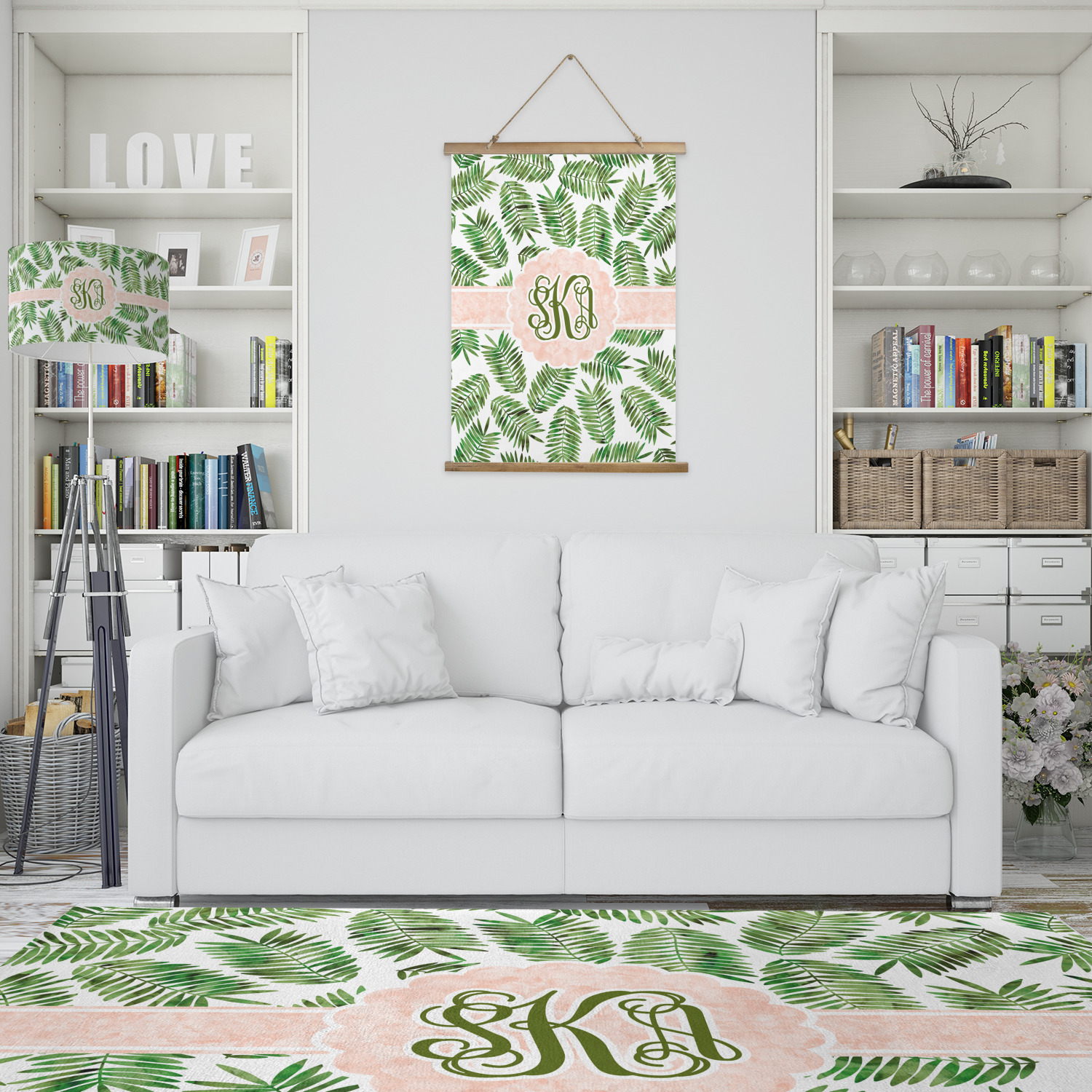 The background of the main design is filled with thin tropical leaves scattered about. The leaves are filled with a dark green watercolor texture. The ribbon and scalloped frame are filled with a light peach watercolor texture. The monogram in the middle gives an extra feminine touch to this design.