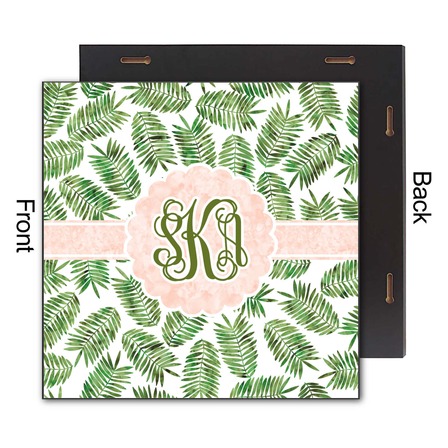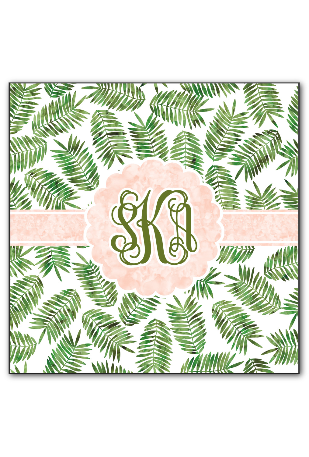 The background of the main design is filled with thin tropical leaves scattered about. The leaves are filled with a dark green watercolor texture. The ribbon and scalloped frame are filled with a light peach watercolor texture. The monogram in the middle gives an extra feminine touch to this design.