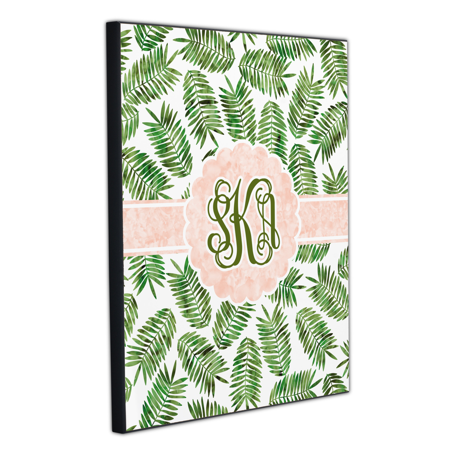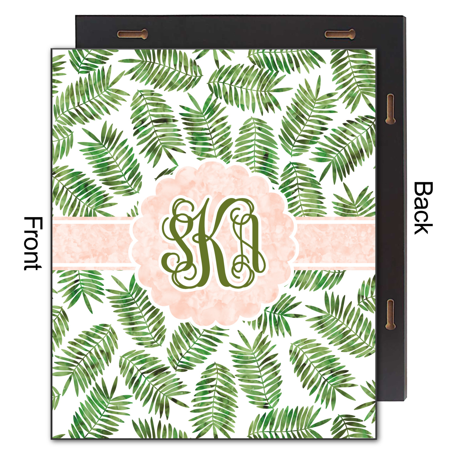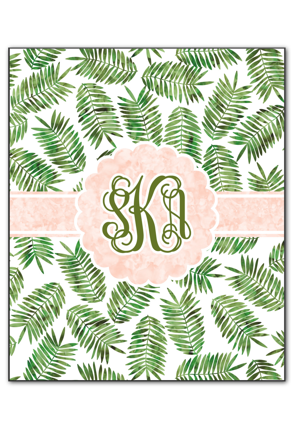 The background of the main design is filled with thin tropical leaves scattered about. The leaves are filled with a dark green watercolor texture. The ribbon and scalloped frame are filled with a light peach watercolor texture. The monogram in the middle gives an extra feminine touch to this design.