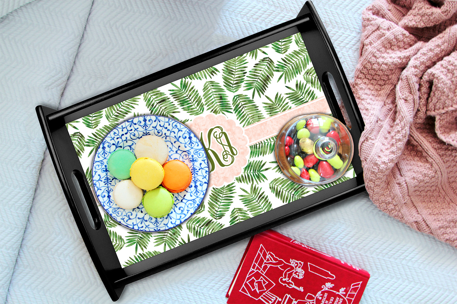 This serving tray with handles features square edges and two rounded sides, creating a very modern look. Each side is fabricated from a beautifully cut, natural wood. The bottom of the interior of the tray displays your customized design in bright, vibrant color. The tray is sold in both a black color and a natural wood look. Each variation of the wood serving tray has two sizes: Small, which is 14" x 10" x 2.25", and Large, which is 19.5" x 13.5" x 2.75".