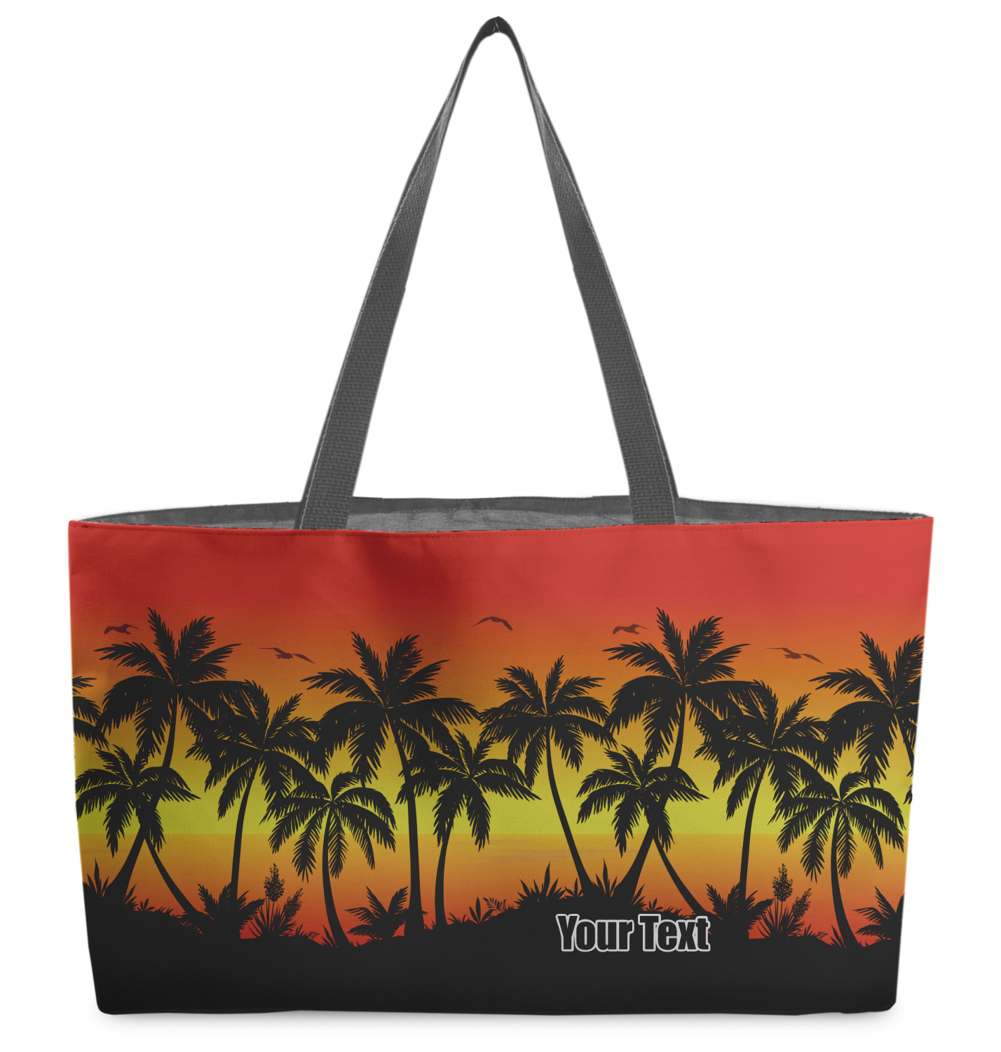 These beach totes are handmade here in the USA. Fabric is printed with your design. The tote is then sewn from the fabric pieces, lining and handles added.