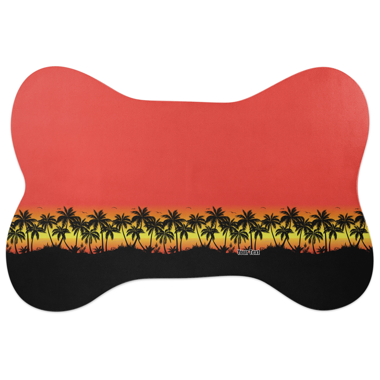 The top of this mat displays your custom design, as it is printed on polyester. To prevent slippage, the underside of the mat is made of rubber. We offer a small dog food mat, suitable for smaller dogs and a large dog food mat for bigger breeds. The small dog food mat is approximately 19 by 13 inches, while the large dog feeding mat measures at approximately 26.75 by 18 inches. Both personalized mats are ideally sized to fit two dog bowls.