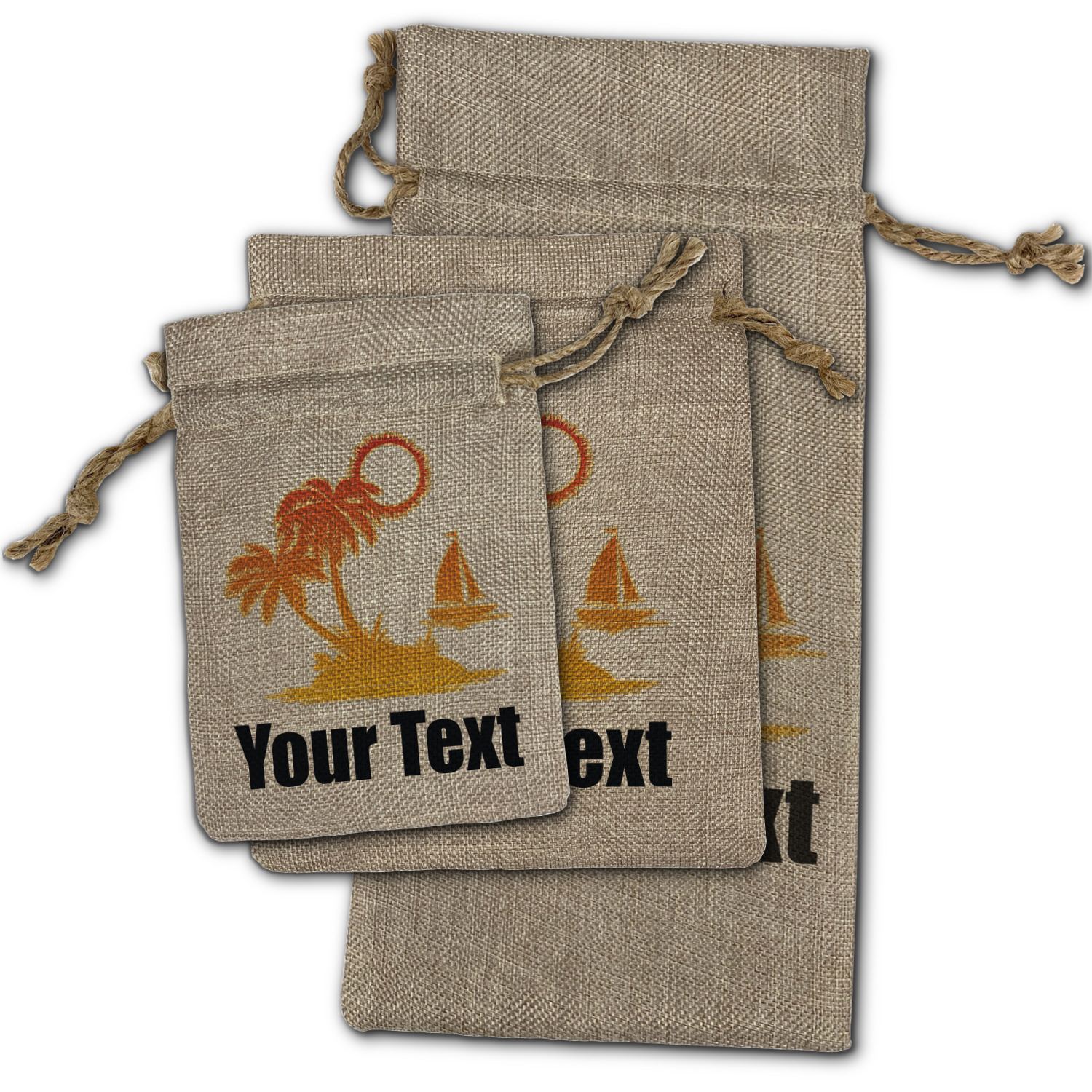 We sell our Burlap Gift Bags in 3 variant sized bags. Made with burlap polyester, each personalized bag can be secured with a twine drawstring pull. Your custom design is available to print on one side or both sides - completely up to you! The sizes of the bags measure approximately 4.5" x 6.5" for the smallest size, 6.5" x 8.0" for the medium size, and 6.5" x 13.5" for the large-sized bag.