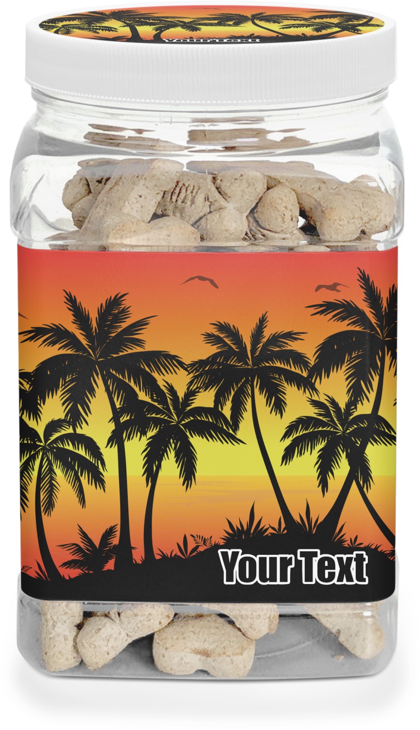 This half gallon jar, made from a sturdy plastic, is the perfect way to keep treats from any naughty pet paws, while still keeping them ready on hand for when your pup performs an impressive trick. This dog cookie jar features a screw-on, white lid that displays your personalized design on a vinyl sticker. We apply another customized sticker that wraps around the front and sides of the jar. Our dog treat jar also has indentations on the rear ends of the sides, which allows for convenient handling, and its square frame allows for easy storage.