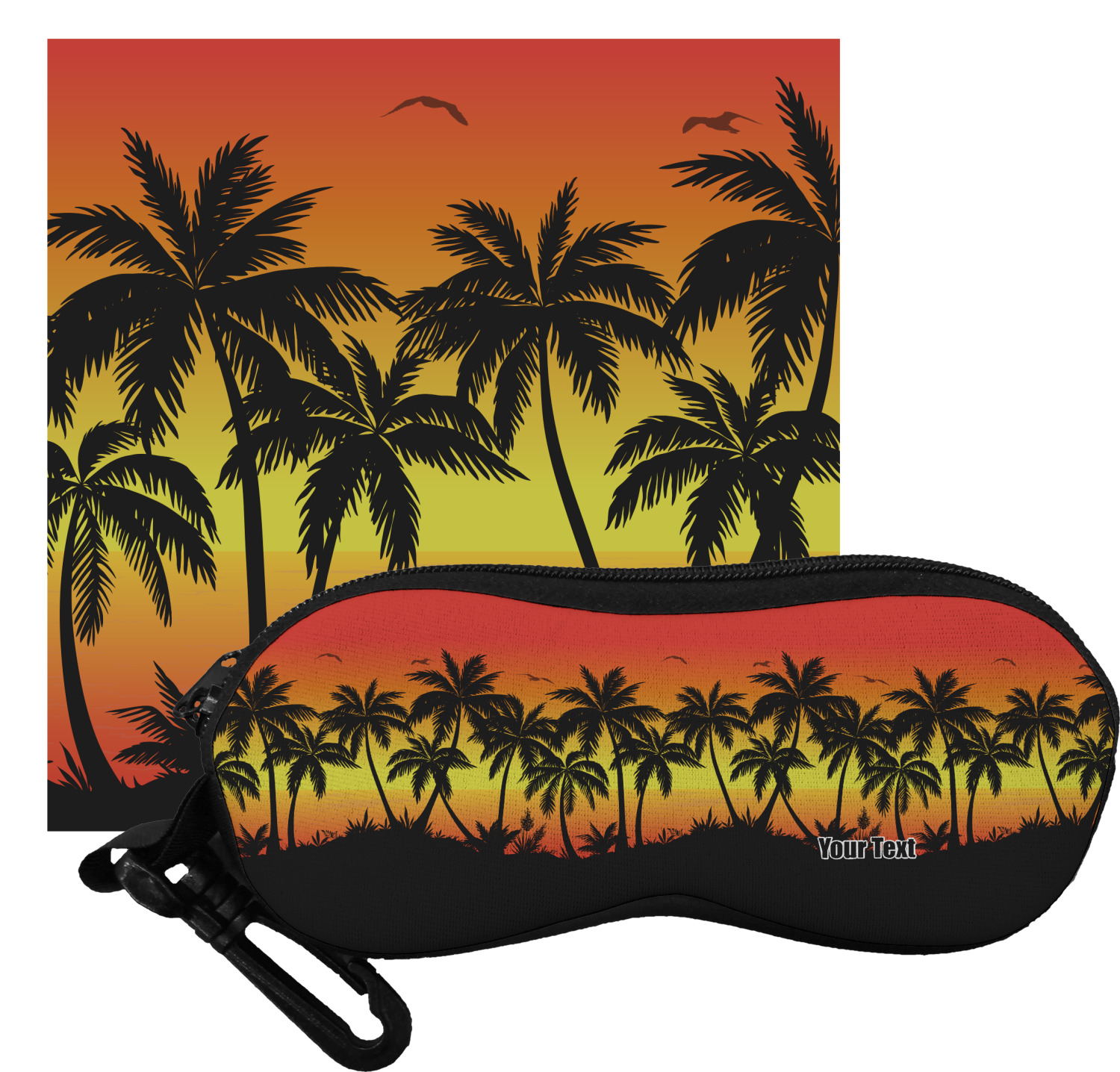 The cases have the design on both sides, a black zipper, and clips for hanging on a belt buckle or purse strap and also include matching lens cloths.