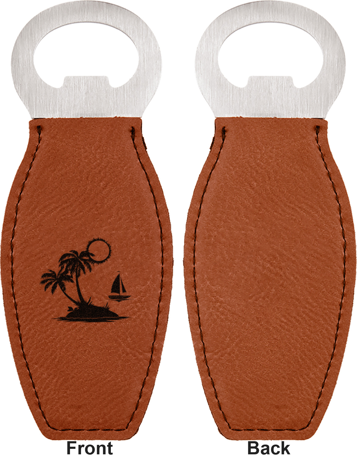 Built from stainless steel, these custom bottle openers are wrapped in a cognac-colored leatherette. Sharp, black stitching lines the edges for extra durability and a finished touch. Your personalization is laser-engraved onto the surface of this leatherette, leaving behind a crisp, black coloration. At 4.6 by 1.8 inches, this beer bottle opener gives you much of leverage when trying to open a stubborn bottle. On the opposite end of the opener, you'll find a magnet that you can use to display your new, unique bottle opener!