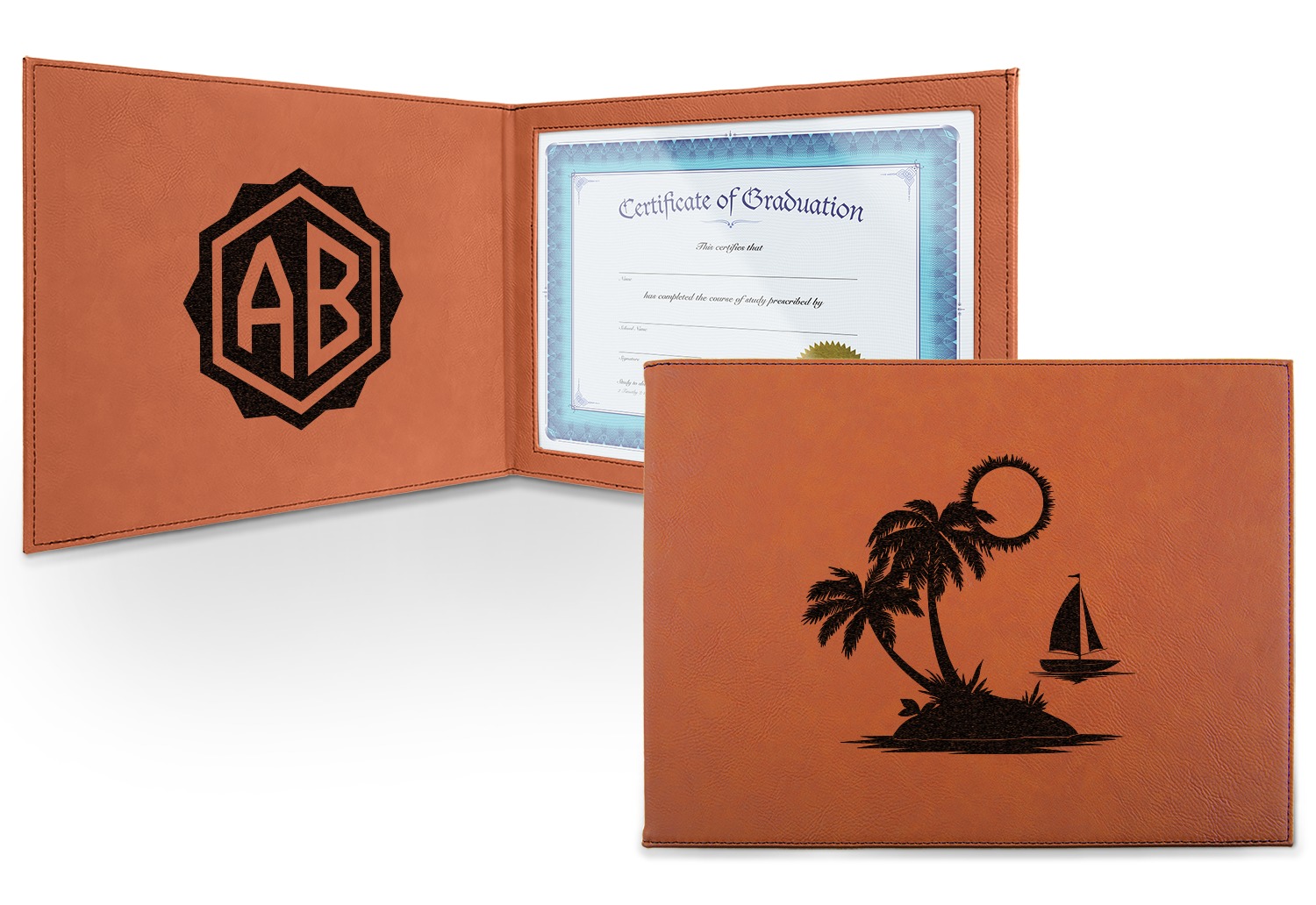 This cognac-colored, leatherette certificate jacket is the ideal way to display or store your hard-earned certificate. When closed, the custom certificate holder measures at 12 by 9 inches. The interior of the certificate cover includes a clear, vinyl window to encase your diploma. The window measures at around 10.5 by 7.5 inches and can accommodate a diploma that measures at up to 8.5 by 11 inches. You can either choose to have your customization laser engraved on the front and interior, or solely the front.
