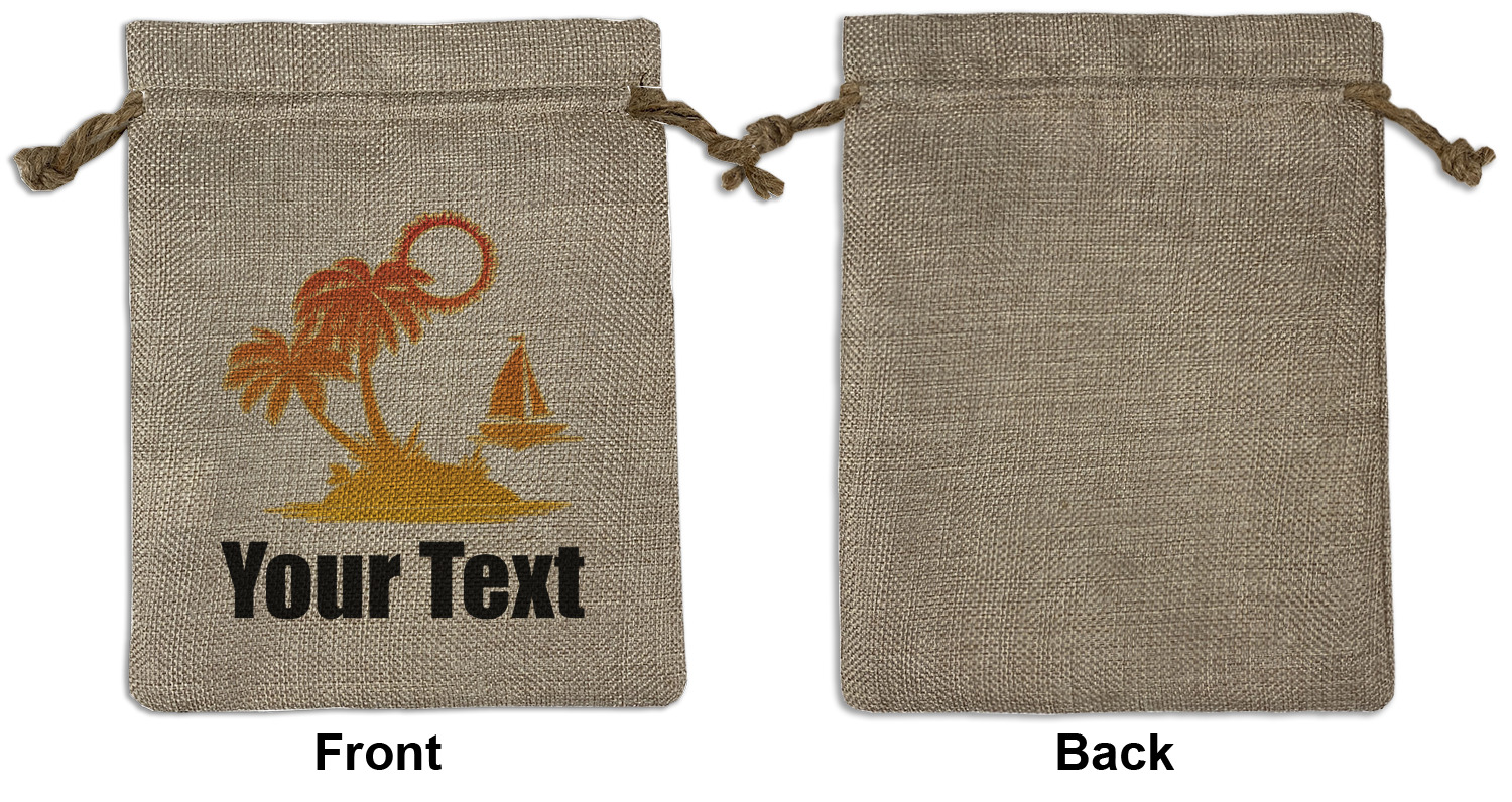 We sell our Burlap Gift Bags in 3 variant sized bags. Made with burlap polyester, each personalized bag can be secured with a twine drawstring pull. Your custom design is available to print on one side or both sides - completely up to you! The sizes of the bags measure approximately 4.5" x 6.5" for the smallest size, 6.5" x 8.0" for the medium size, and 6.5" x 13.5" for the large-sized bag.