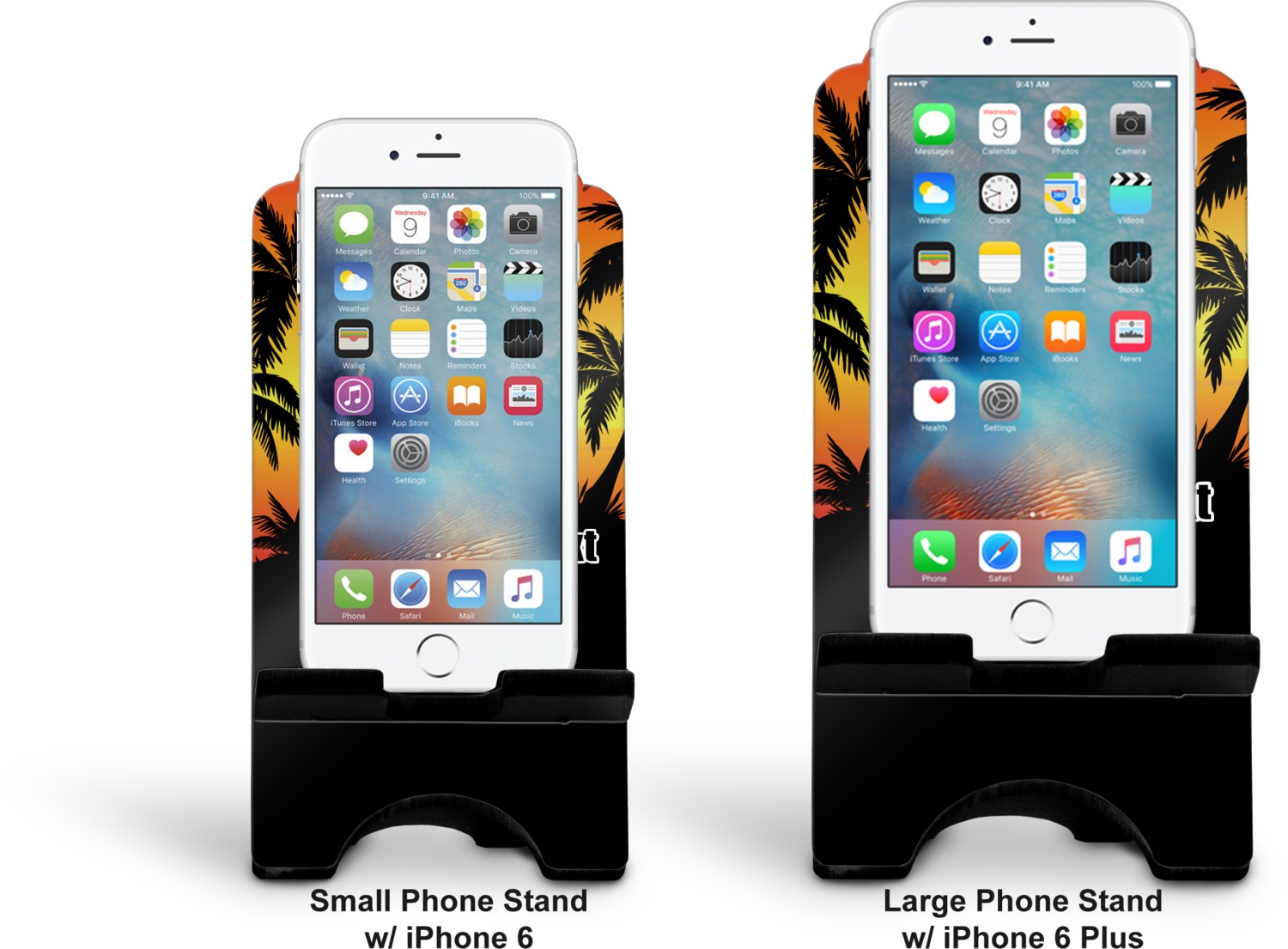 To meet your needs, we offer four variations of this IPhone stand. The backboard of the first version is shaped as a plain, yet sleek rectangle, and is available in two sizes. Our smaller size is approximately 4 by 3.25 by 7 inches, while the larger model is 4 by 3.77 by 8.5 inches. Alongside this model, we also provide you with a more decorative option. The upper part of our second version features a curved edge, for a classy, suave appearance. This phone holder is also sold in two sizes: a smaller version, which is 4 by 3.25 by 7 inches, and our larger model, which is 4 by 3.77 by 8.5 inches. Both models will support large phones, but the larger model is better if you wish to proudly display your personalized design.