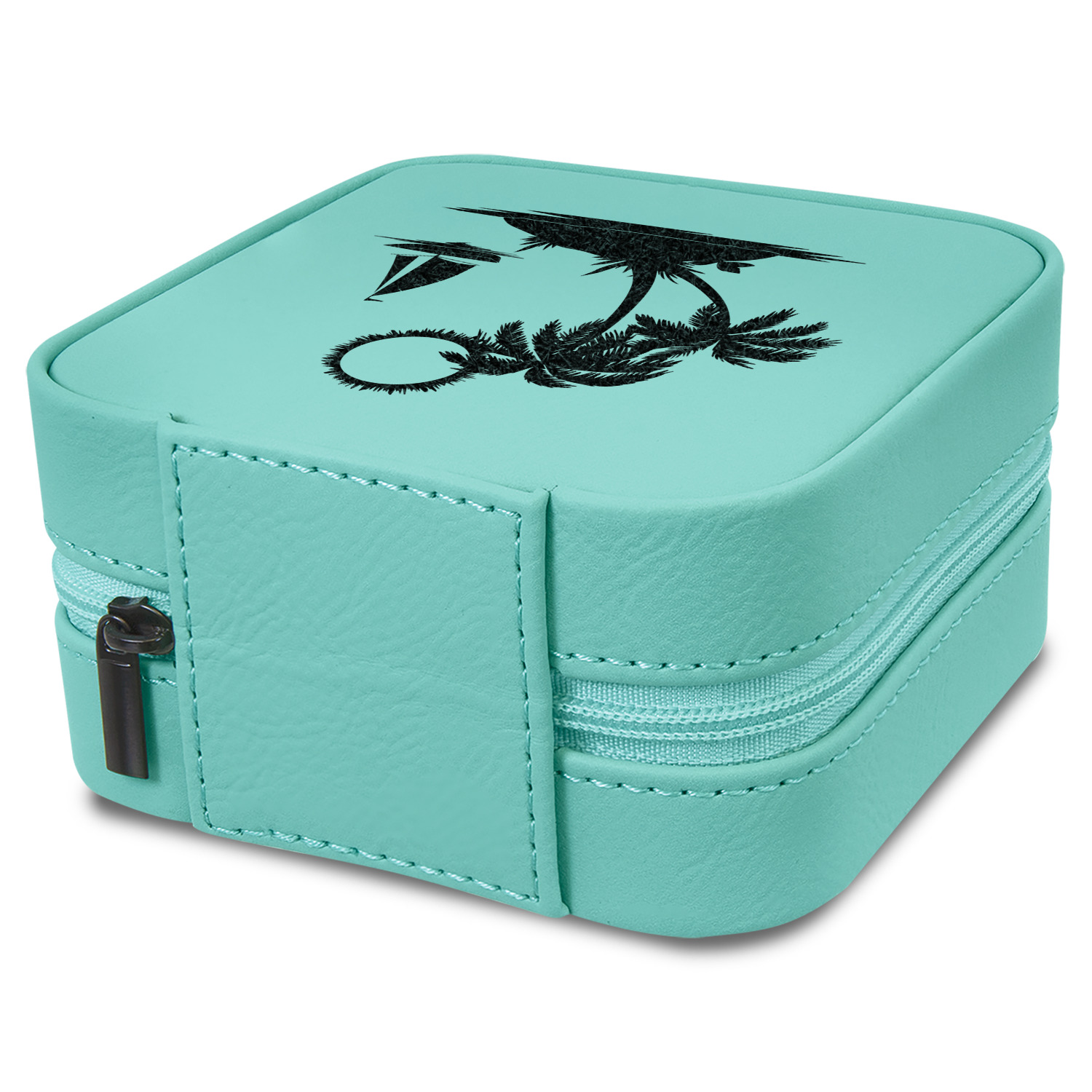 This square zippered travel jewelry box is made from leatherette and is available in four colors - classic cognac / rawhide, a beautiful teal. navy blue or pink. The tan colored soft velvet inside has compartments and hooks for all your jewelry - rings, chains, earrings, bangles etc.