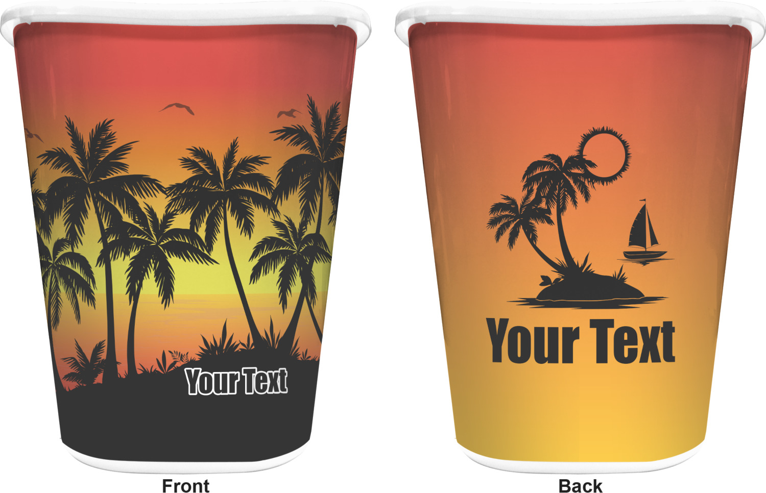 You can choose to purchase these decorative wastebaskets in either a white or a black color that will show on the base and the upper rim. Your customization is printed on a high-gloss, fine-quality vinyl adhesive, and you can choose to either have this adhesive applied to one side only or to both sides. As such, this plastic wastebasket can be single-sided or double-sided, depending on your creative vision. Your customization is printed using durable inks, making the design waterproof and resistant to fading over time.