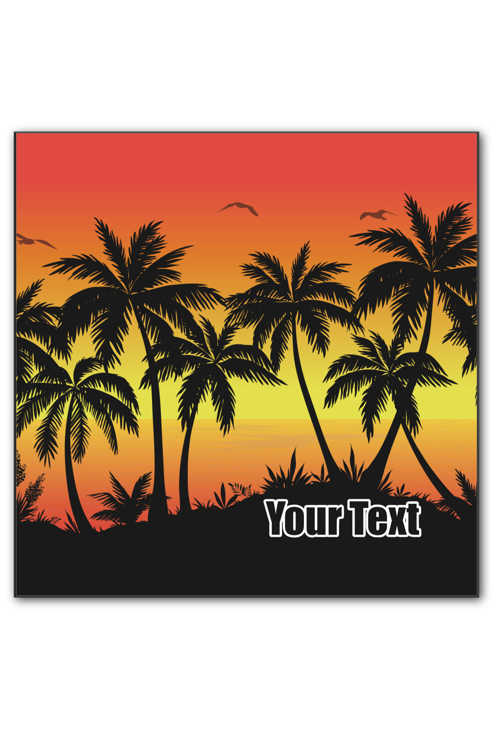 Jump into our design center to get going. Pick other backgrounds or fonts. Even pick out a monogram or graphic to go with your tropical sunset. If you ever need any help in our design center feel free to give us a call or hop on our online chat. We are always happy to help.