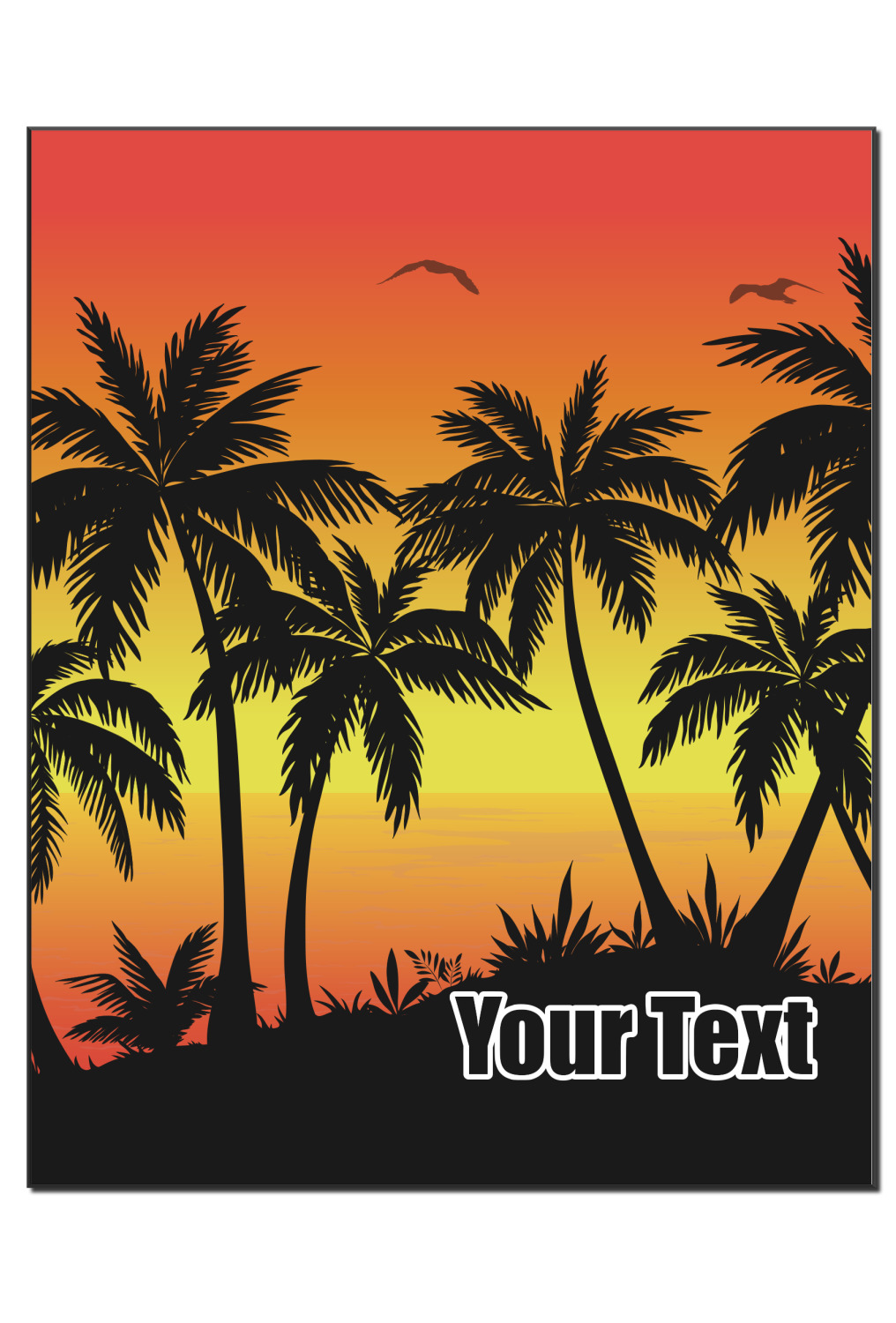 Jump into our design center to get going. Pick other backgrounds or fonts. Even pick out a monogram or graphic to go with your tropical sunset. If you ever need any help in our design center feel free to give us a call or hop on our online chat. We are always happy to help.