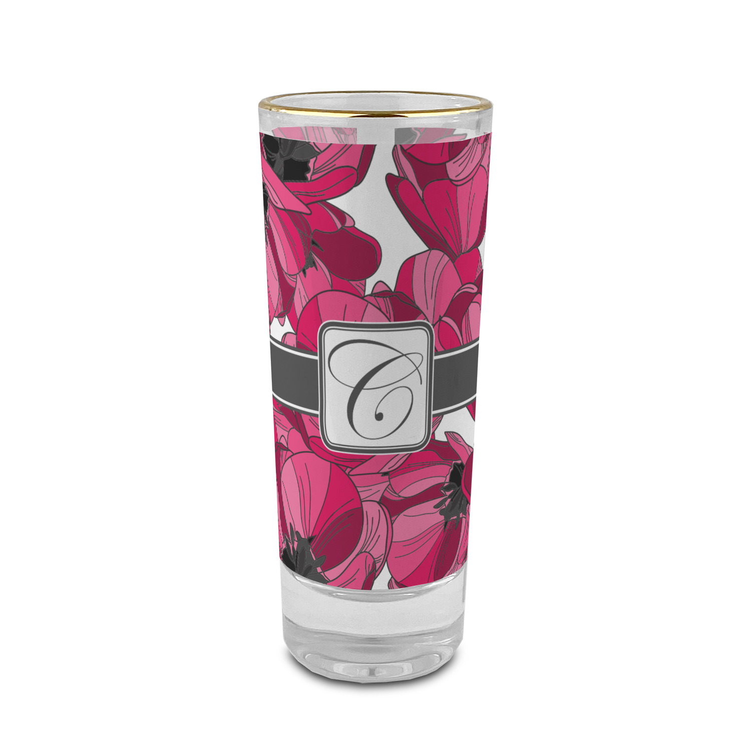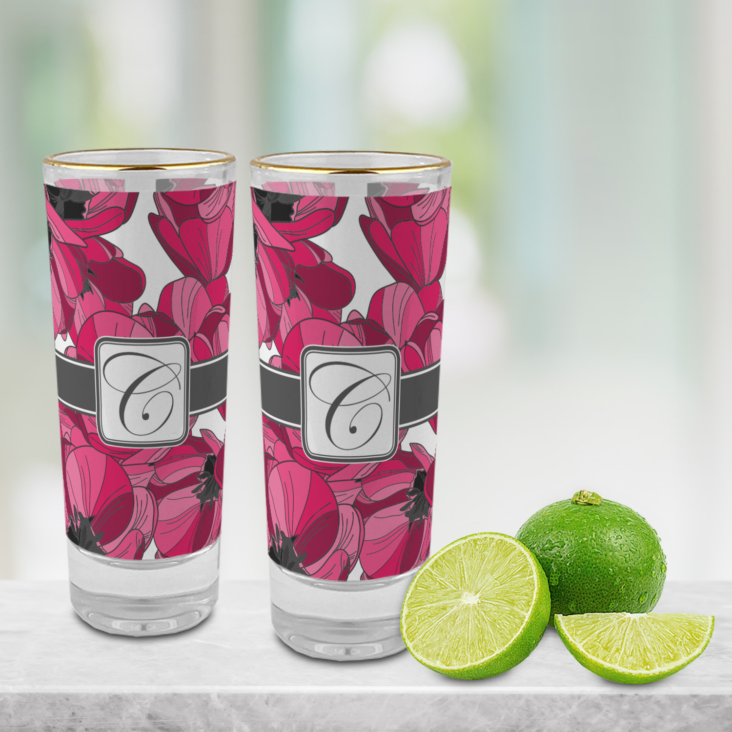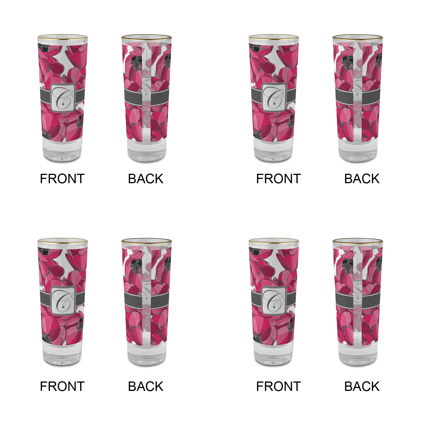 These glass shooter glasses are printed in full color with the design of your choice. These are a tall shooter 2 oz size and stand 4" tall. The print is a full wrap design to boldly display your personalization.