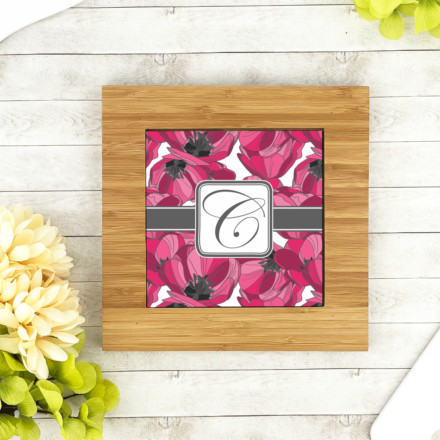 The tulips design has a classic ribbon in dark grey along with square label for your personalization.