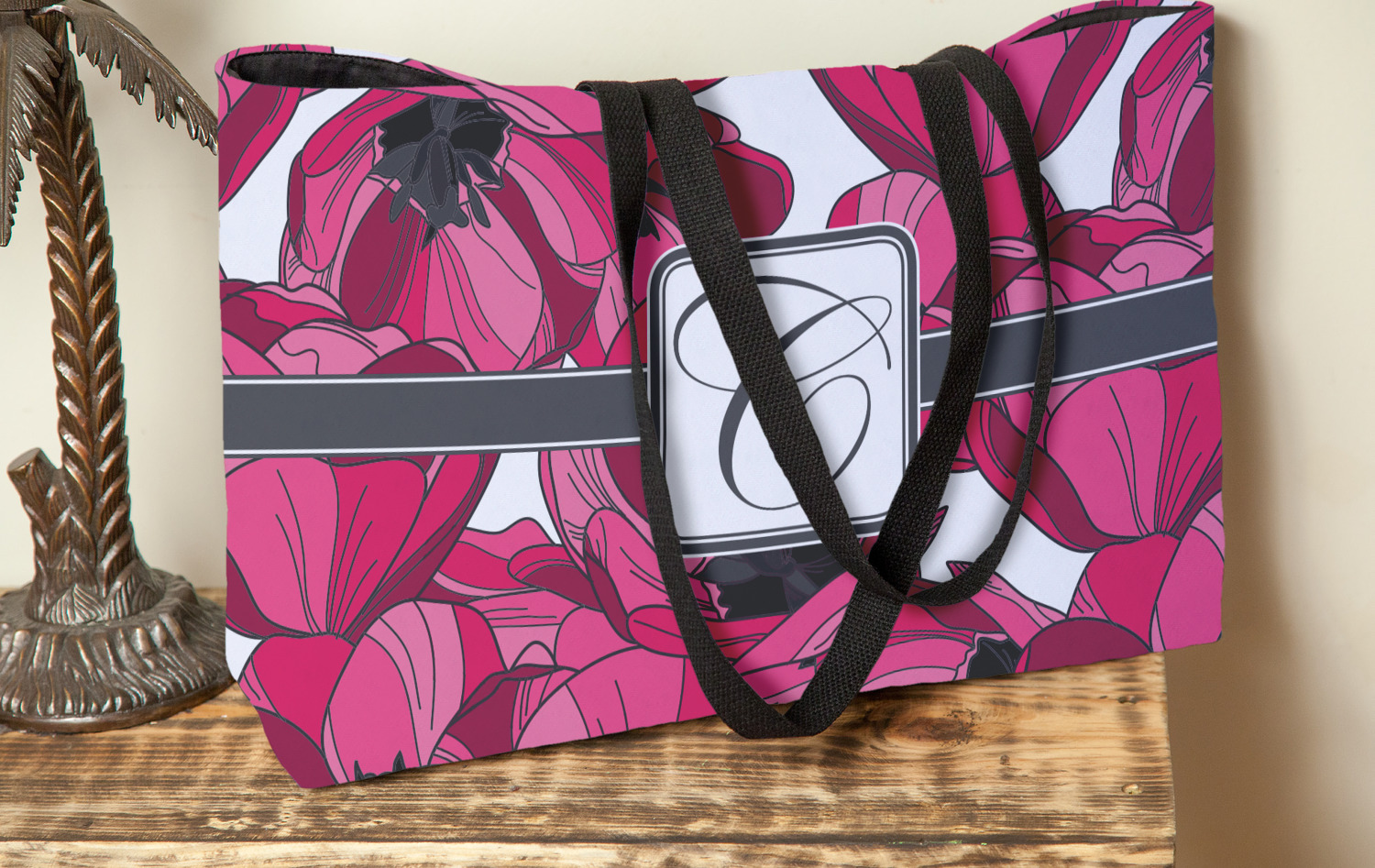 These beach totes are handmade here in the USA. Fabric is printed with your design. The tote is then sewn from the fabric pieces, lining and handles added.