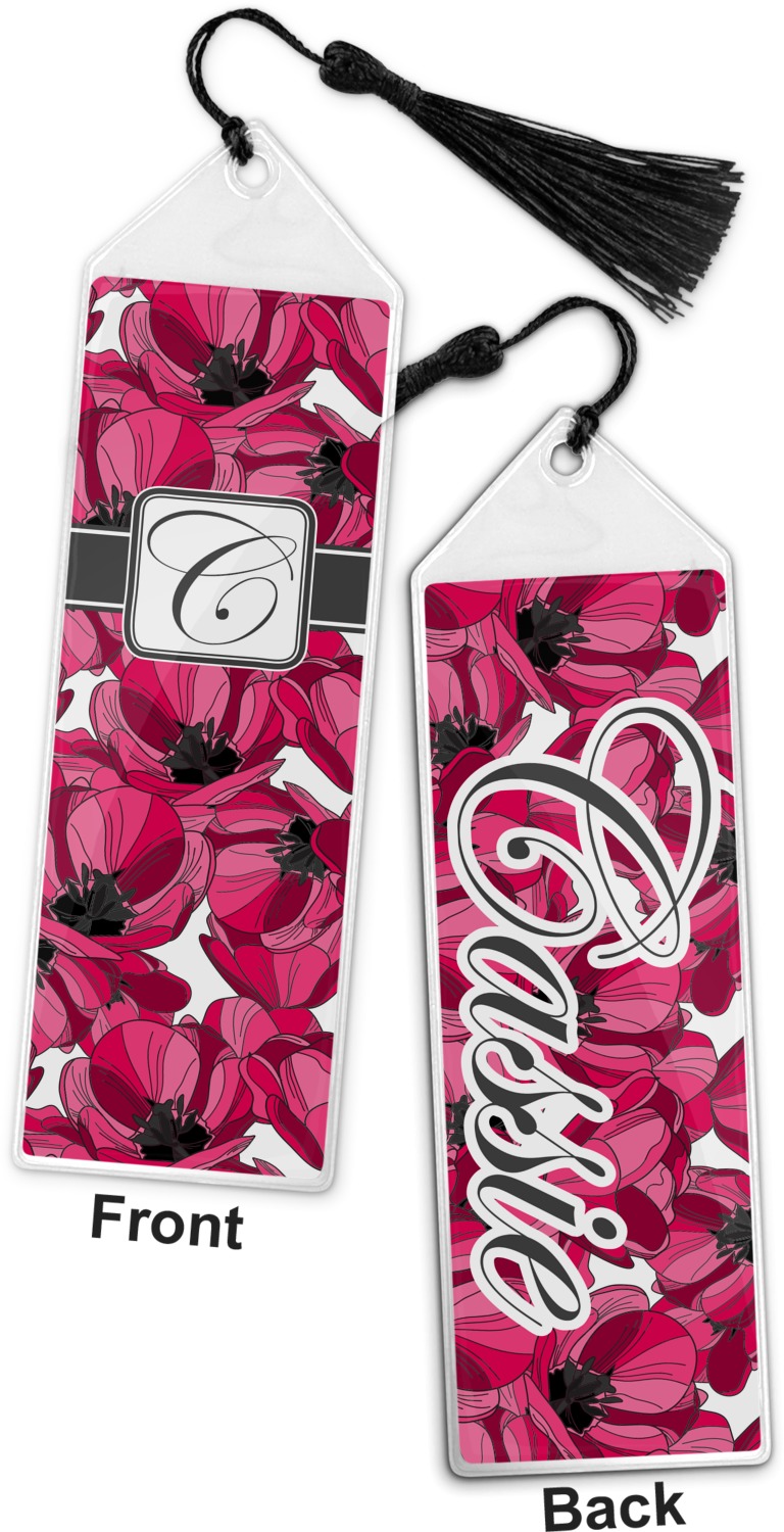 Your personalized bookmark is made of a sturdy, clear vinyl, and is approximately 7.5" x 2.25". We display your personalization on vinyl inserts that are placed on both sides. Accompanying each book marker is a black, fringe tassel that attaches to the reinforced, triangular header.