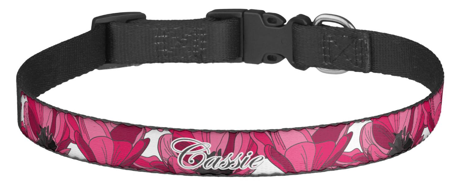 This sturdy collar, made from a durable nylon weave, will outlive your dog's episodes of excited tugging and pulling. Courtesy of its thick plastic buckle and adjuster, this collar is adjustable and accommodating of any dog. Structurally, the collar is a single piece of nylon weave that is sewn together, and features a solid metal loop where you can attach a leash or dog tag. We print and display your dog's name and pattern across the middle of the personalized dog collar.