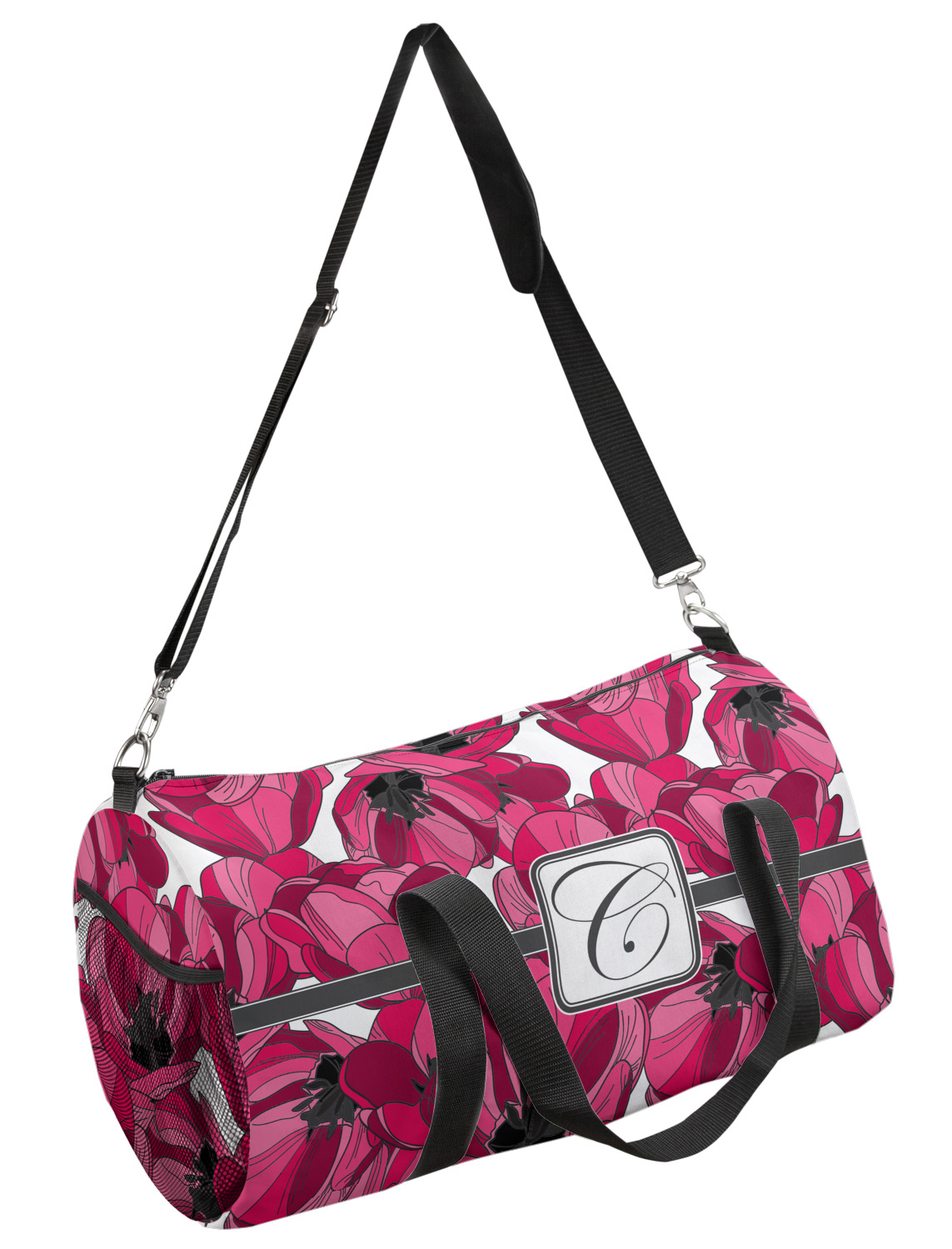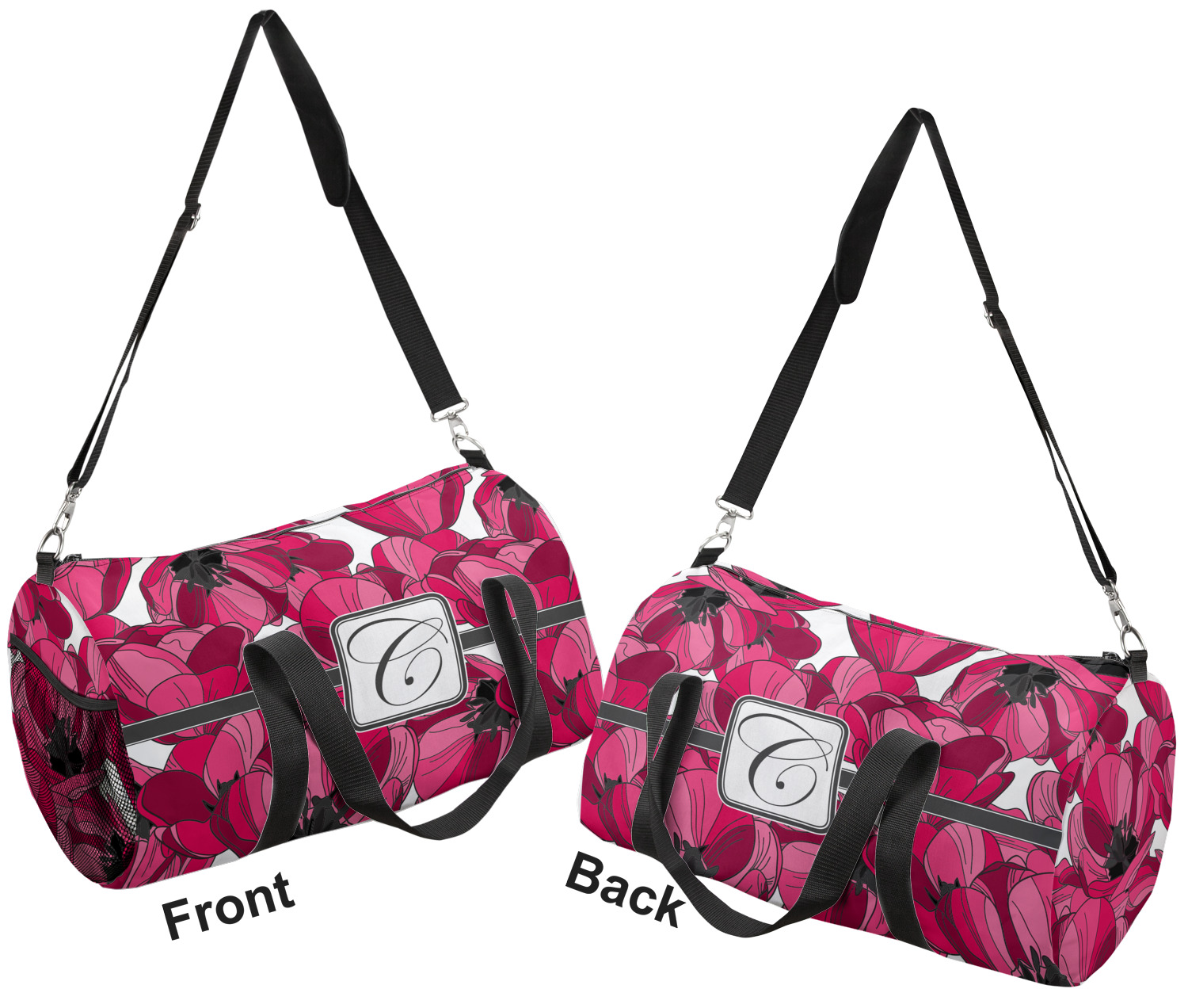 This duffle is a sturdy bag made of a canvas material. It comes in two sizes: Small (19"W x 9.5"H x 9.5"D) and Large (23"W x 12"H x 12"D). The bag is a cylindrical shape with a black adjustable strap and two handles. On one side is an elastic pouch to put a waterbottle or other small item. Your product will be sublimated with your design and is able to be designed on the front, back, and sides. Be sure to remember that the straps may cut into parts of your design if you upload your own artwork.