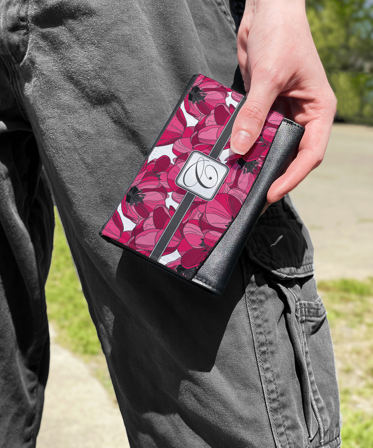 The compact size of this wallet - 5.5in wide, 3.5in tall and 0.75in thick when folded - makes it perfect to hold in hand and small enough to fit in a clutch or a normal size purse. The outside flap is customized with your choice of artwork and closes with a snap closure - with two different snaps to allow it to be adjusted when storing more items - to securely fasten the flap.