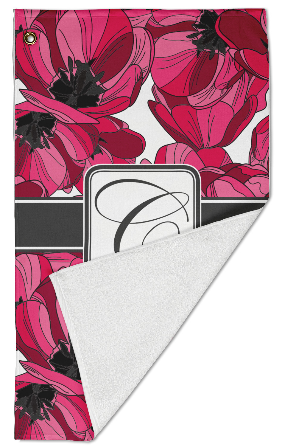 The towel is fully printed / patterned on the front polyester side; and is white on terrycloth cotton backside. The towel has grommet and a pear spring clip in the top left corner. Our golf towels are available in 100s of different prints and patterns.