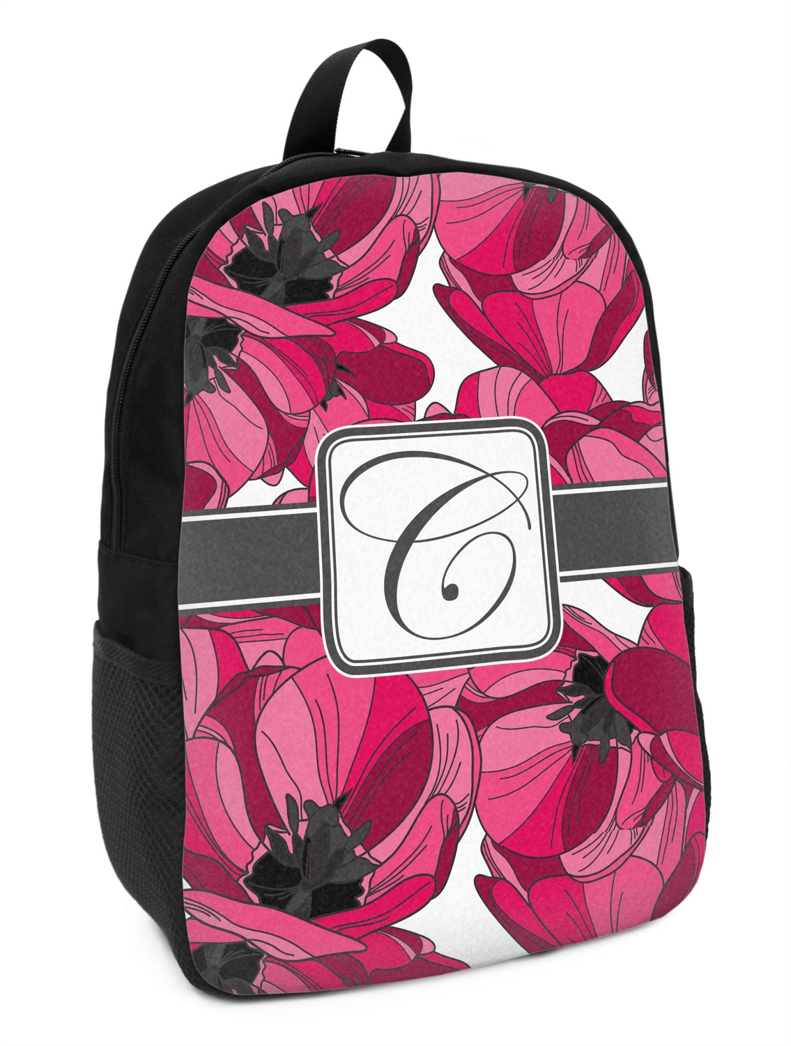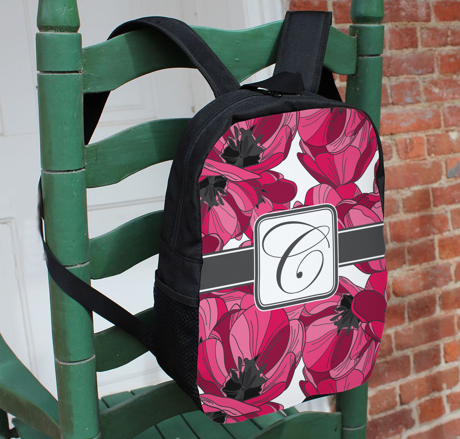 These small backpacks are made of a durable black canvas material with your personalization right on the front. The two shoulder straps are padded and easily adjustable. The bag itself measures at about 11" W x 15" H x 5" D. It's the perfect size for elementary aged kids or adults who want a smaller backpack. On the top of the bag you will find a handle to hang or carry your backpack by as well as a large zipper closure to keep all of your belongings safe inside. On each side of your backpack is a mesh pocket for a small item or water bottle. Inside your backpack you will find a spacious area with a small zipper pocket and a padded laptop slot that will fit up to a 13" laptop (13" being very snug). This is the perfect bag for any student that needs a couple books and their laptop with them at all times. It also works great as a carry on for traveling!