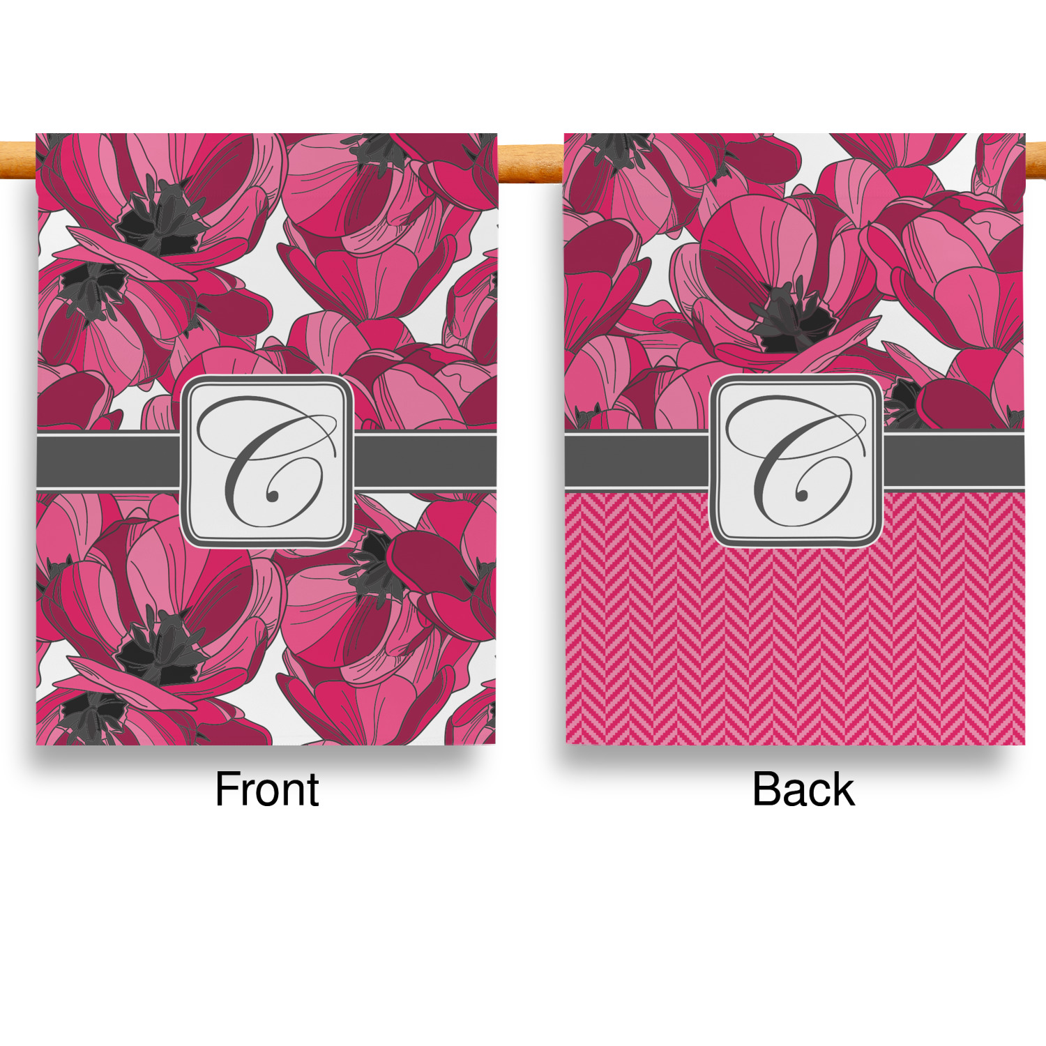 These custom garden flags are made of a durable, double-ply, polyester weave, allowing them to withstand the elements year round. The small flags measure at approximately 12 by 18 inches. The large flags measure out to 28 by 37 inches. You can order these decorative flags with your customization printed on the front only, or the front and back.