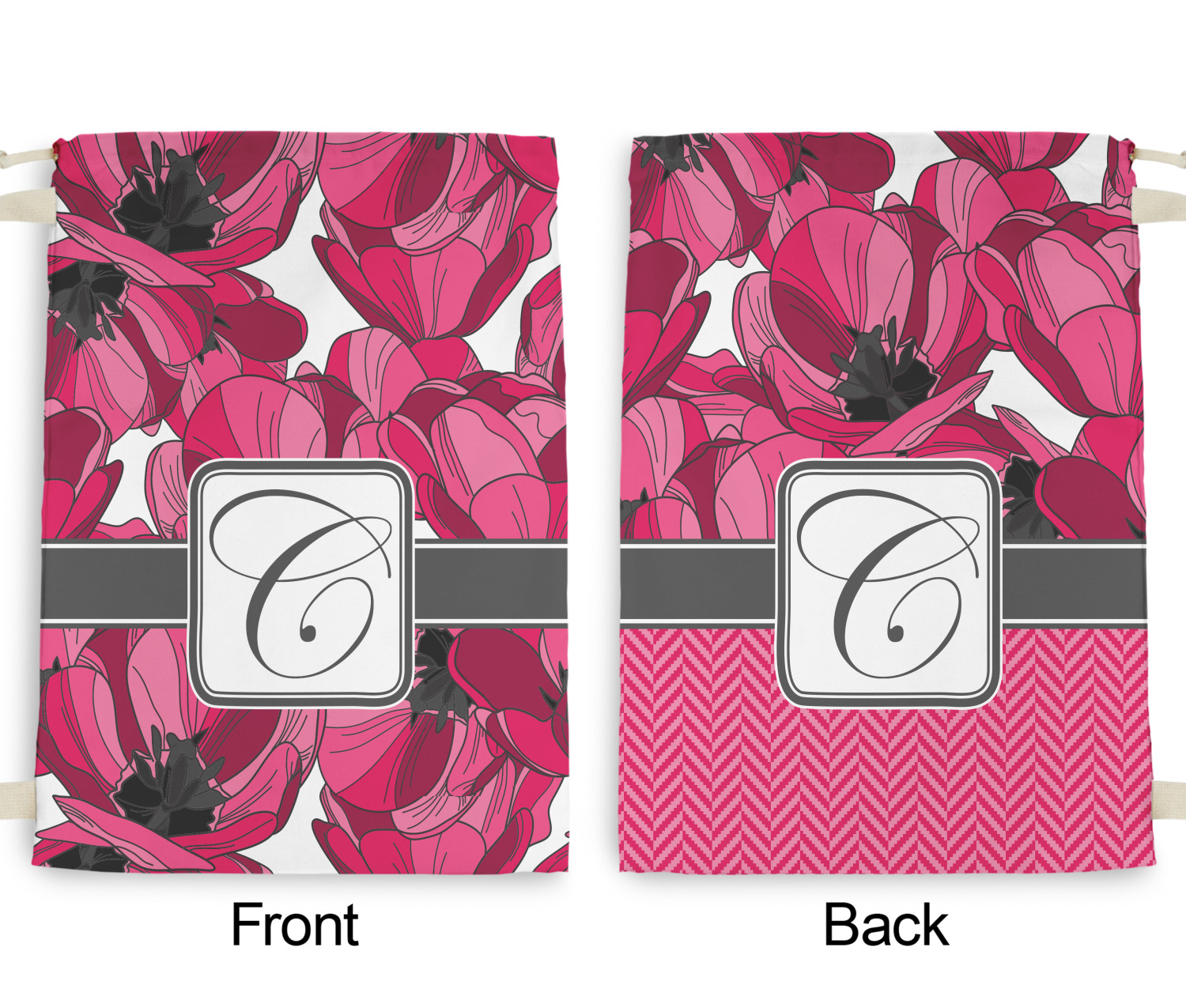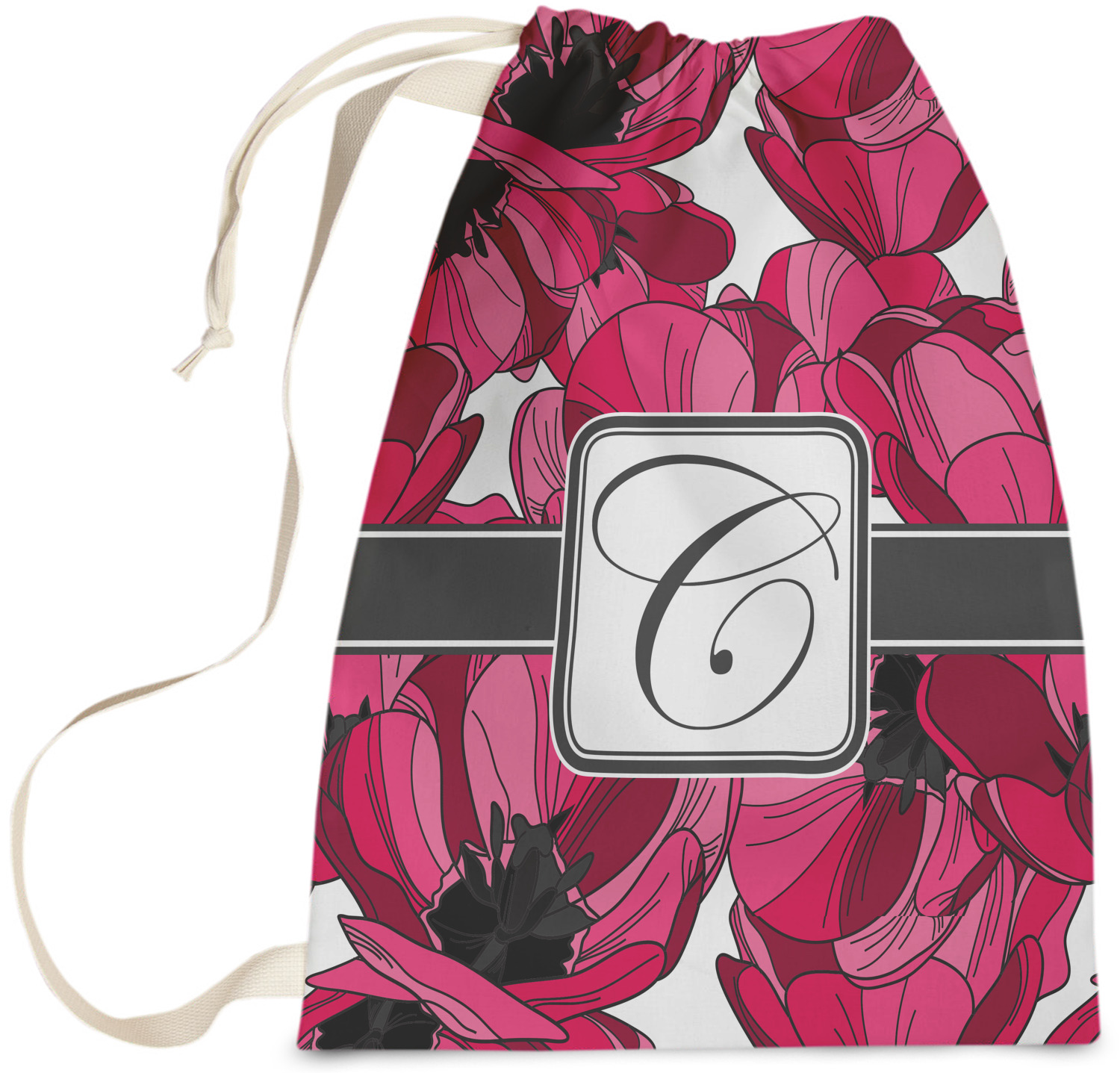 Carry your laundry in style with these customized laundry bags. Available in two sizes, featuring a natural colored woven strap and a cinch cord, these bags hold a lot of clothes or anything else you want to fit in them.