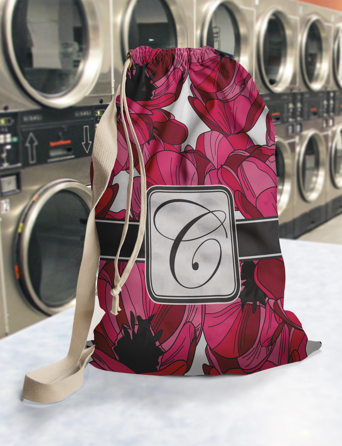 Carry your laundry in style with these customized laundry bags. Available in two sizes, featuring a natural colored woven strap and a cinch cord, these bags hold a lot of clothes or anything else you want to fit in them.
