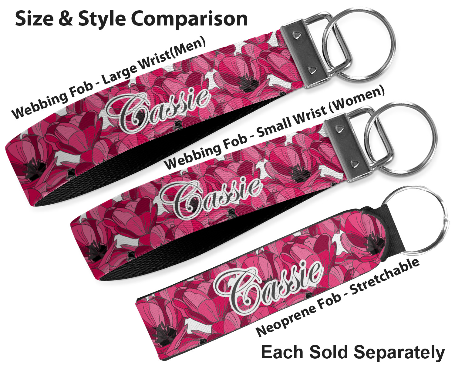 Made from neoprene, these key fob wristlets are comfortable, cushioned, easy to slip on and off; these traits allow it to maintain a slim, yet fashionable appearance, all while optimizing your efficiency. When attaching or removing keys, simply squeeze open the included metal ring. These fobs measure at around 4 inches, and have a bit of a stretch. Thus, they are best suited for small to medium size wrists. If you require a larger size, check out our webbing keychain fob for larger sizing.