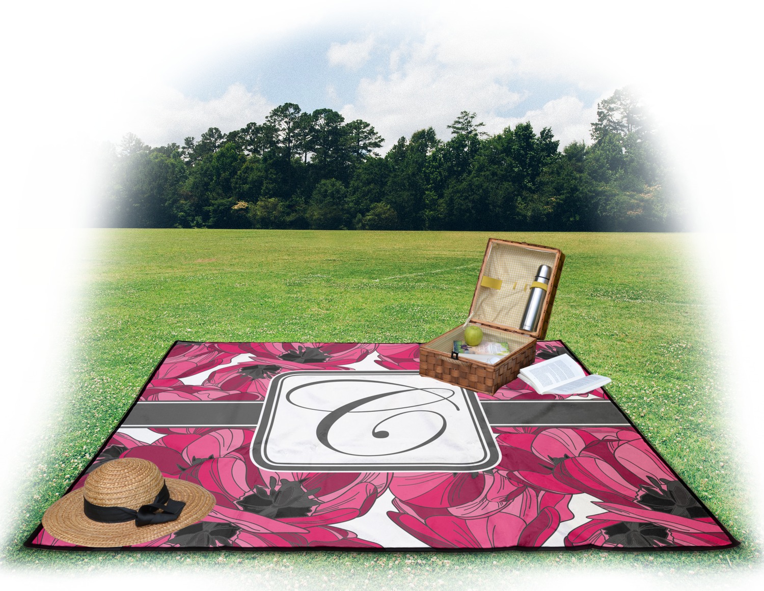 This picnic blanket is perfect for hanging out with your friends at the park or anywhere outside. The top of the blanket is made of a super soft microfiber fleece. The bottom of the blanket is made of a black material similar to a rain jacket and is water repellent as well. This will keep any wet spots on the ground from soaking through your picnic blanket. No one likes a wet blanket. The blanket measures at approximately 50" x 59" and has a nicely finished ribbon edge.