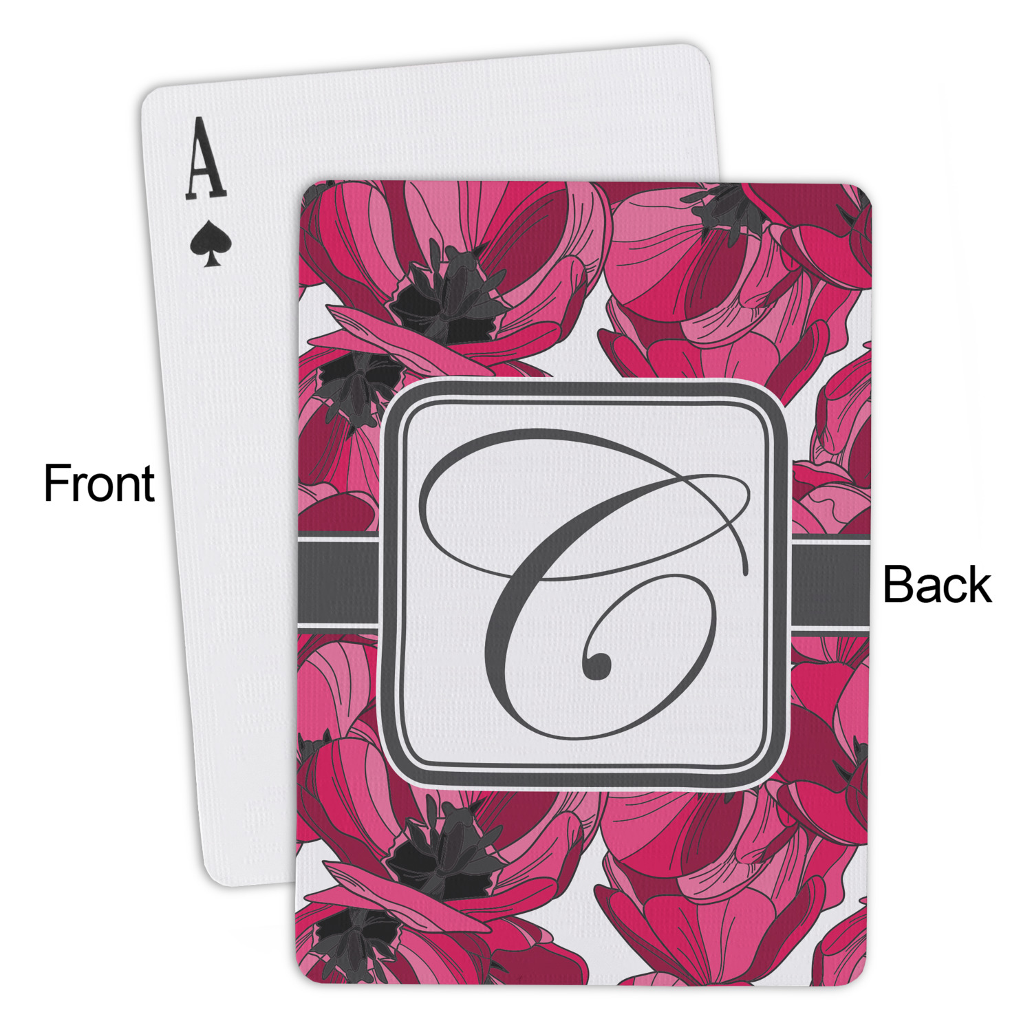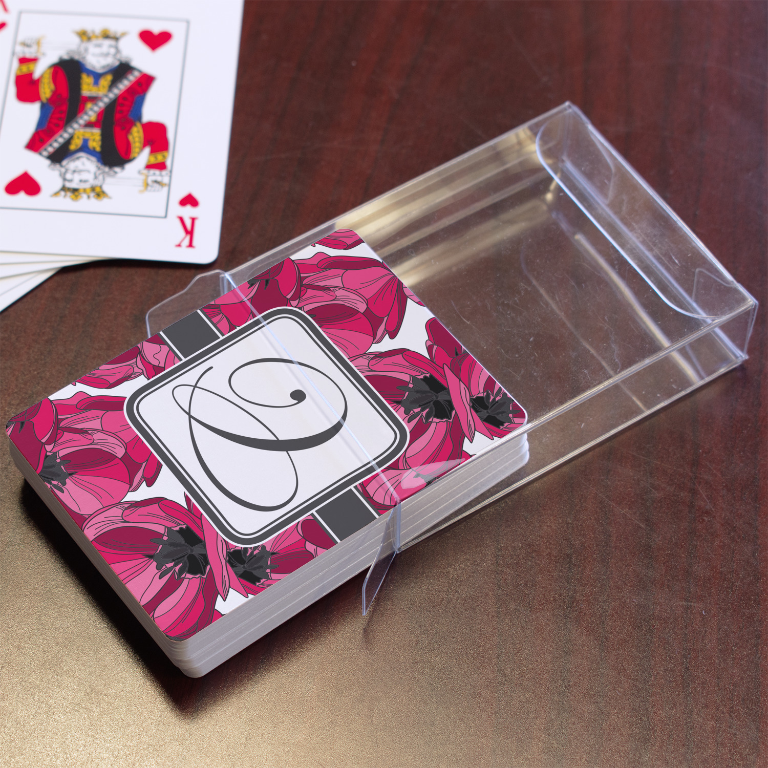 The customization / personalization is printed on the back side. The playing cards have a low gloss coating on both sides. The cards are packaged in a clear plastic box.